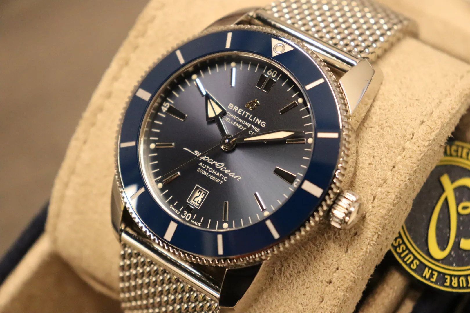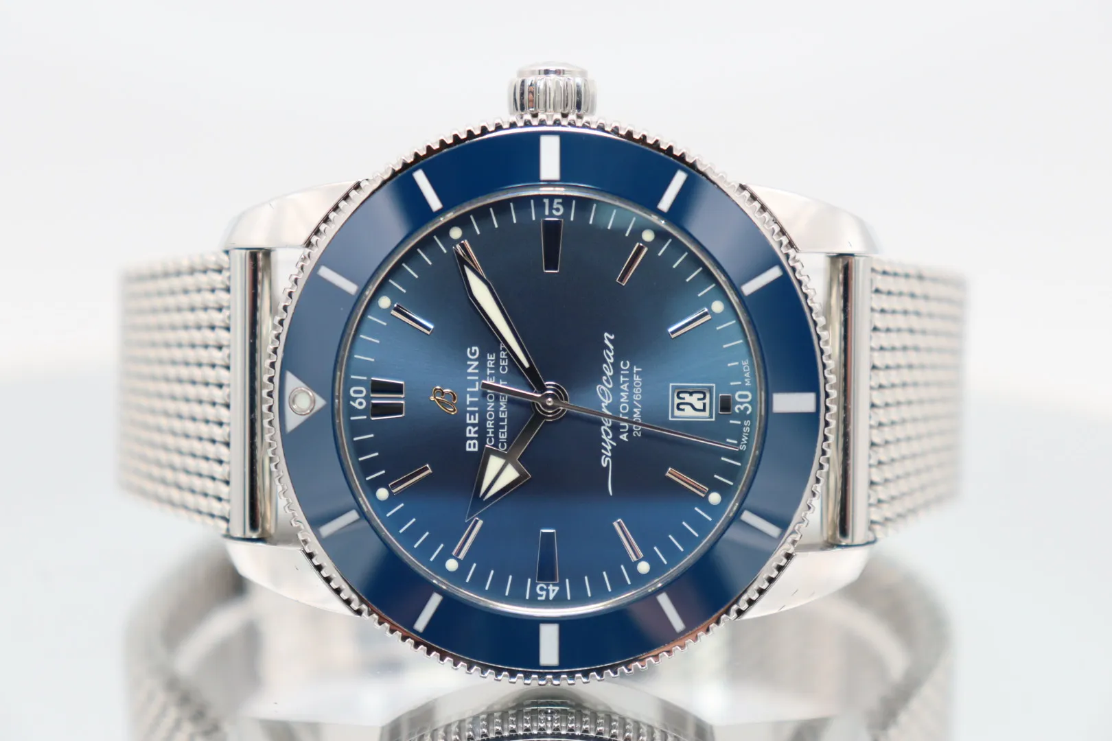 A bold and contemporary dive watch, the Breitling Superocean Heritage B31 combines vintage-inspired design with modern engineering and robust construction. With its clean lines and commanding 46mm case, this model delivers strong wrist presence while maintaining the refined aesthetic that defines the Superocean Heritage collection.This 2024 example features a substantial 46mm stainless steel case paired with a blue ceramic bezel, offering excellent scratch resistance and long-lasting colour depth. The striking blue dial is fitted with baton hour markers for a clean and legible display, maintaining the model’s sleek and uncluttered appearance. Protected by a scratch-resistant sapphire crystal, the watch is built for durability and everyday wear. The stainless steel bracelet completes the cohesive sport-luxury profile, providing strength, comfort, and versatility.Powered by a reliable Breitling automatic movement, the Superocean Heritage B31 offers dependable precision and performance. Presented in good condition, this watch comes complete with its papers, has been fully Watch Register checked, and is backed by a 12-month TGL warranty for complete peace of mind.