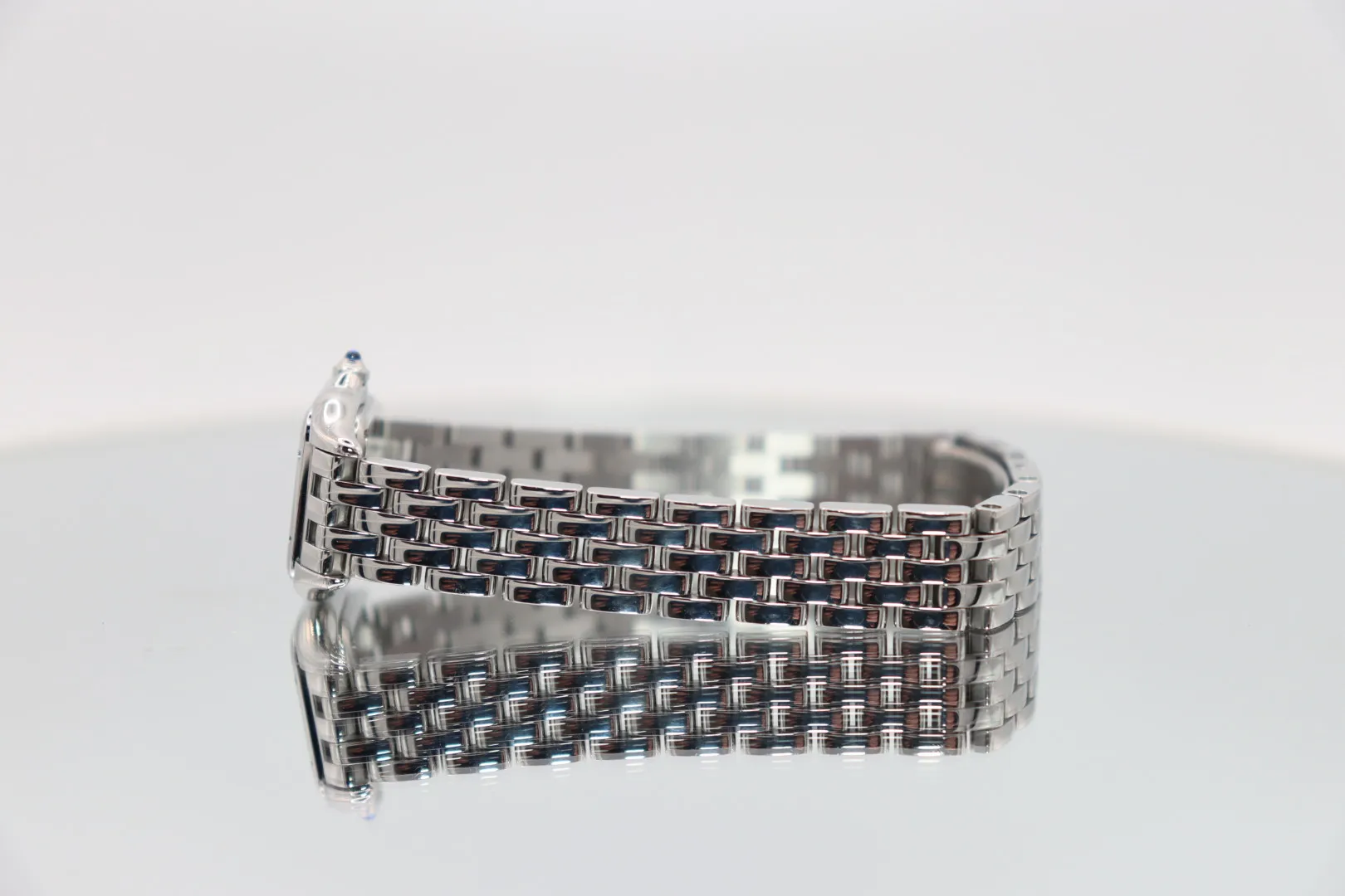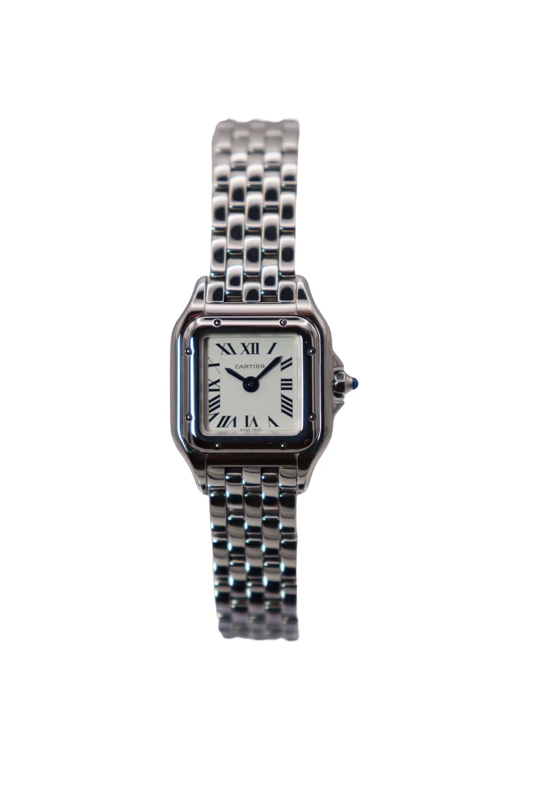 Elegant, refined, and instantly recognisable, the Cartier Panthère Ref. WSPN0012 is one of Cartier’s most iconic jewellery watches. First introduced in the 1980s, the Panthère collection is celebrated for its seamless bracelet design, square case, and effortless blend of watchmaking and high jewellery aesthetics.This 2025 example features the elegant Mini 25mm stainless steel case paired with the signature Panthère bracelet, renowned for its supple multi-link construction that drapes comfortably on the wrist like fine jewellery. The classic silvered dial is adorned with Cartier’s iconic Roman numeral hour markers and blued steel hands, creating a timeless and sophisticated display.Protected by a scratch-resistant sapphire crystal, the dial remains crisp and legible, while the polished stainless steel construction enhances the watch’s refined and luxurious appearance. Powered by a precise Swiss quartz movement, the Panthère offers dependable timekeeping with minimal maintenance.Presented in excellent condition, this watch comes as a complete full set with its original Cartier box and papers from 2025. Fully Watch Register checked and backed by a 12-month Time Group London warranty, it offers complete peace of mind.