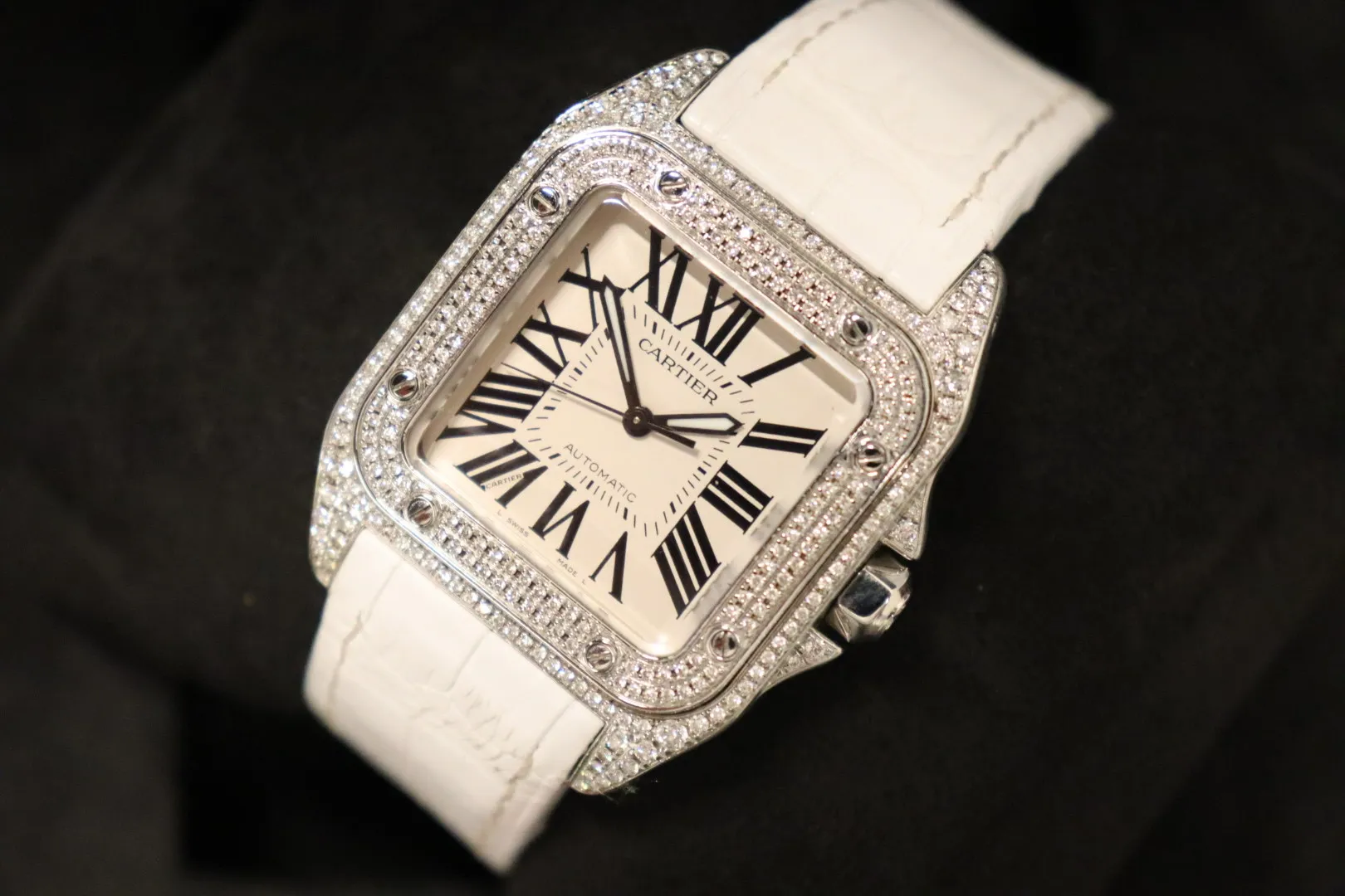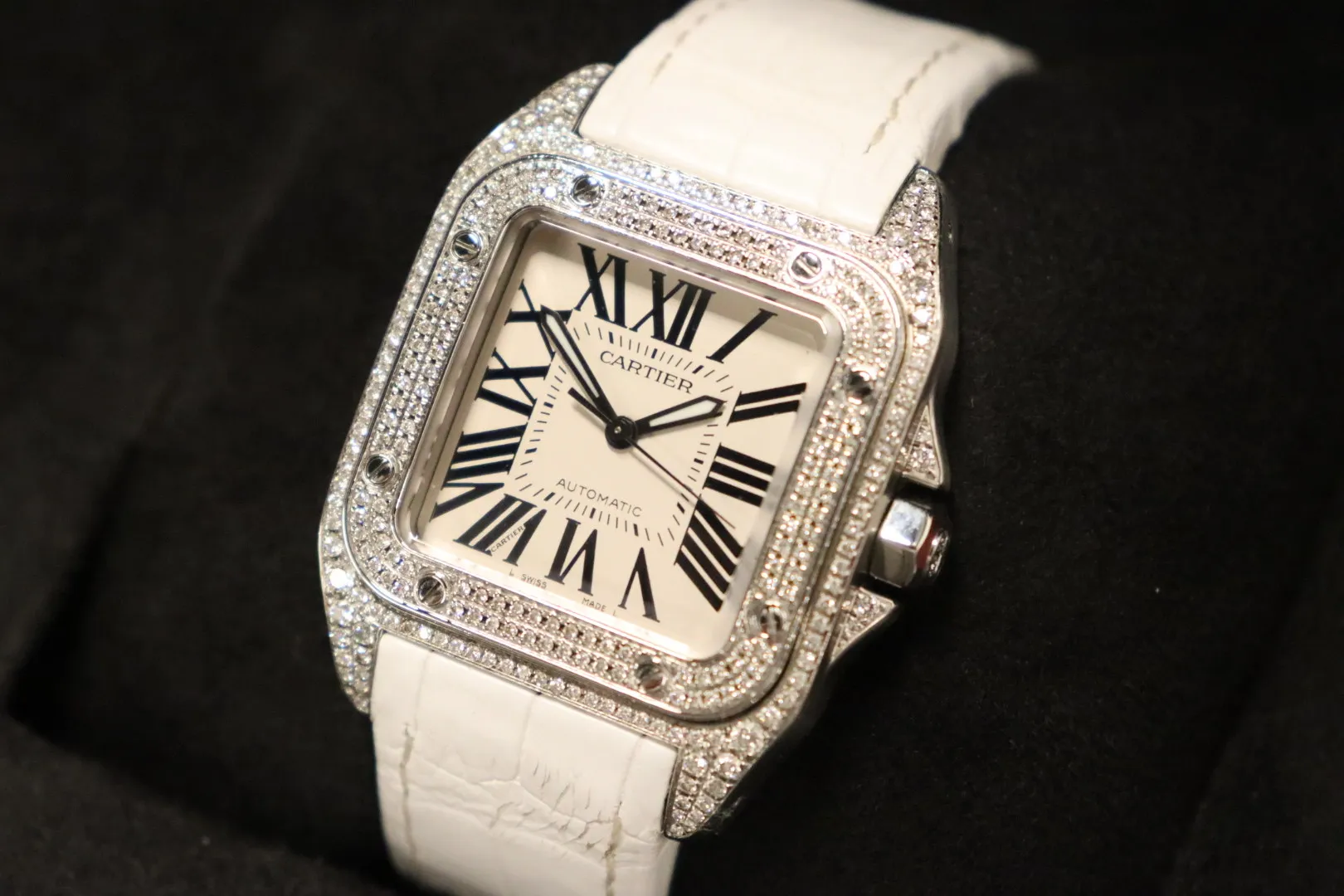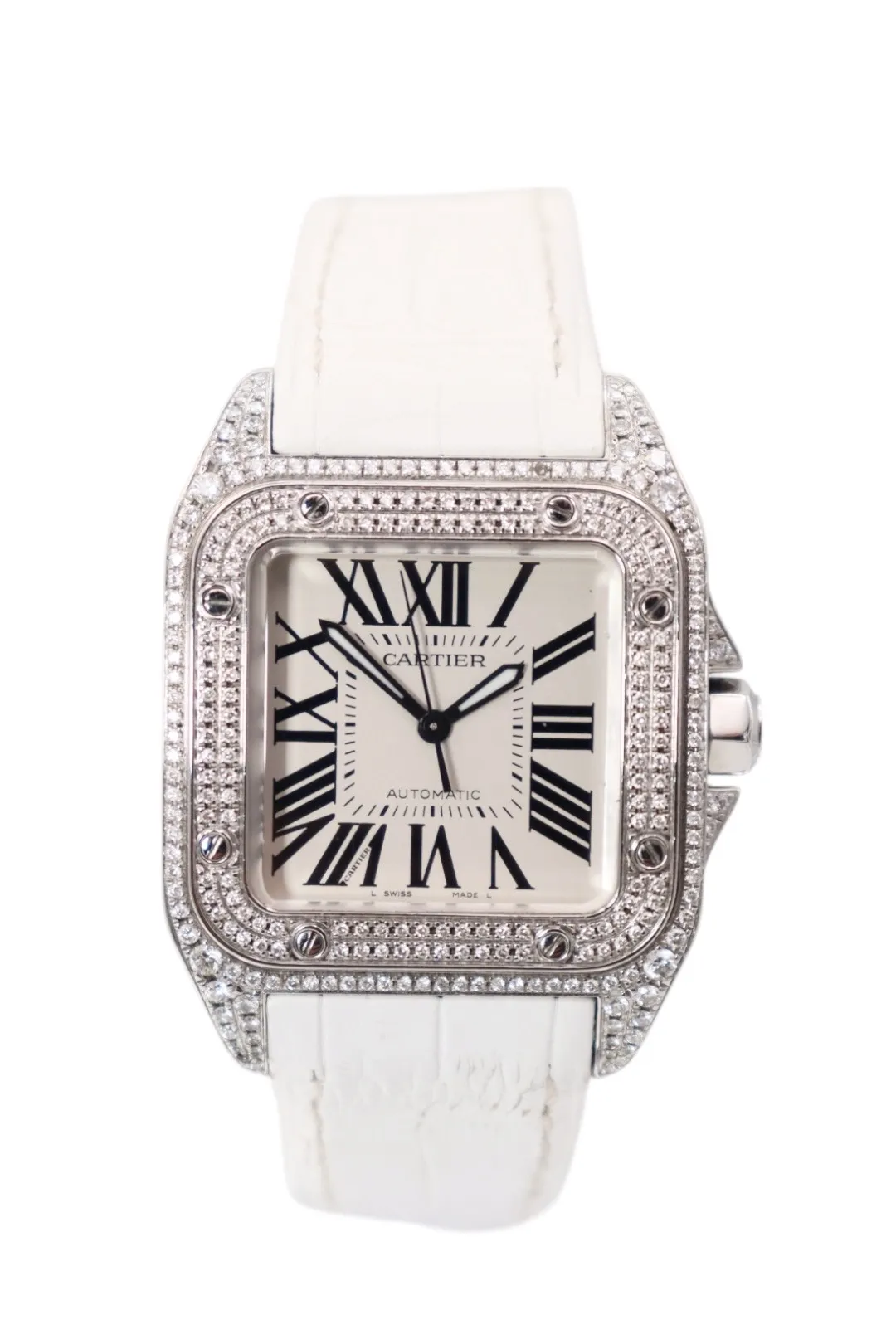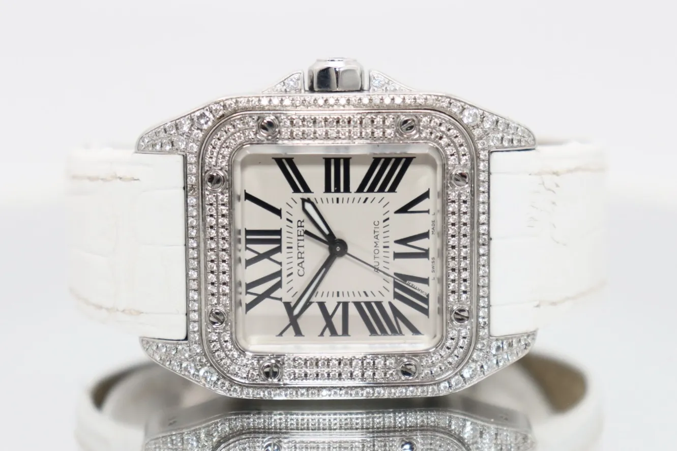Cartier Santos 100 Midi Aftermarket Diamond Bezel White Strap – Ref. 2878