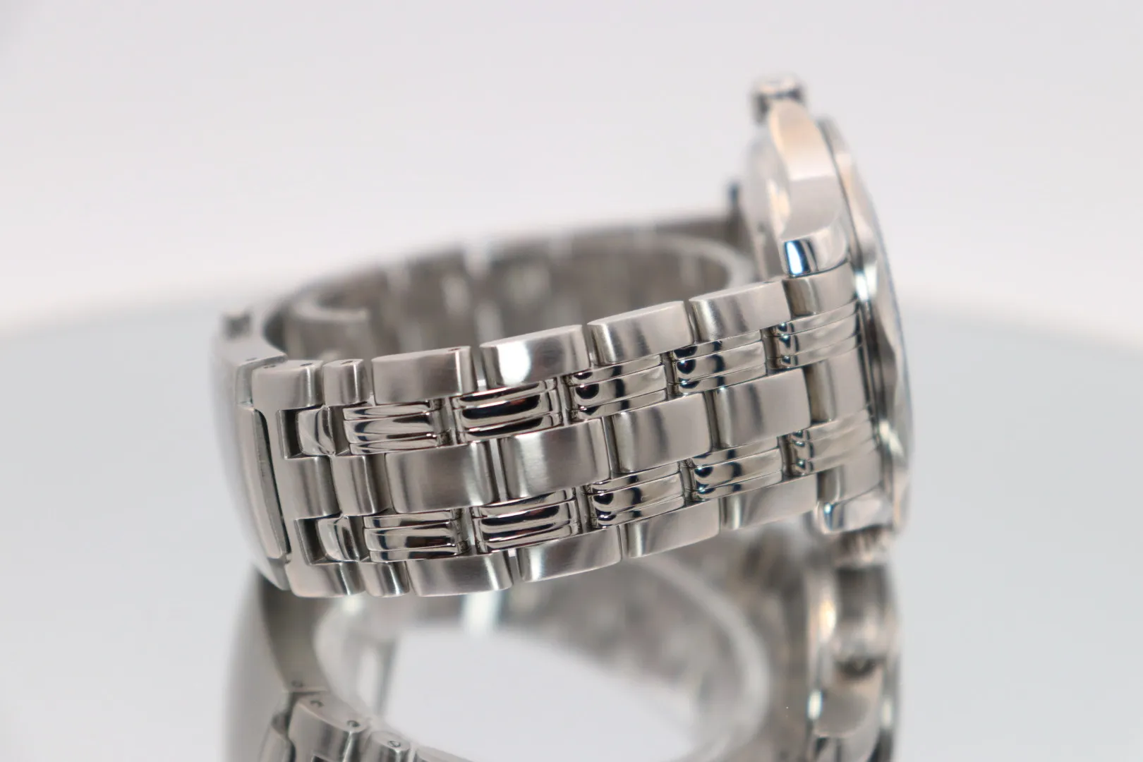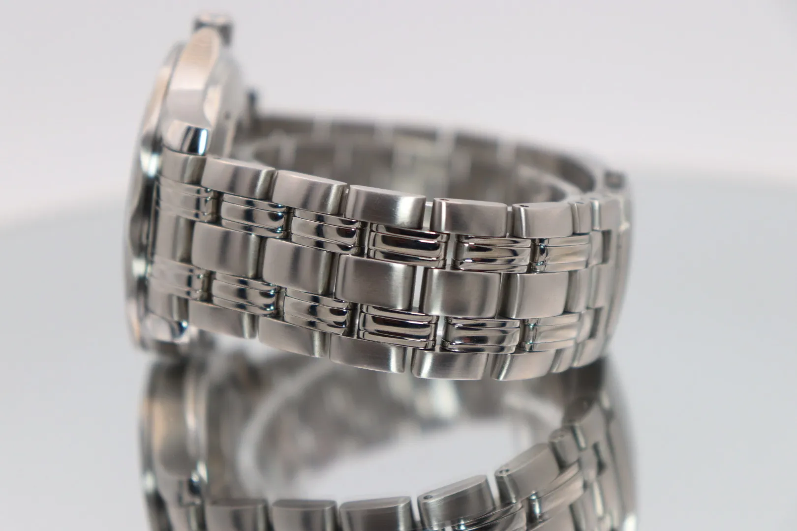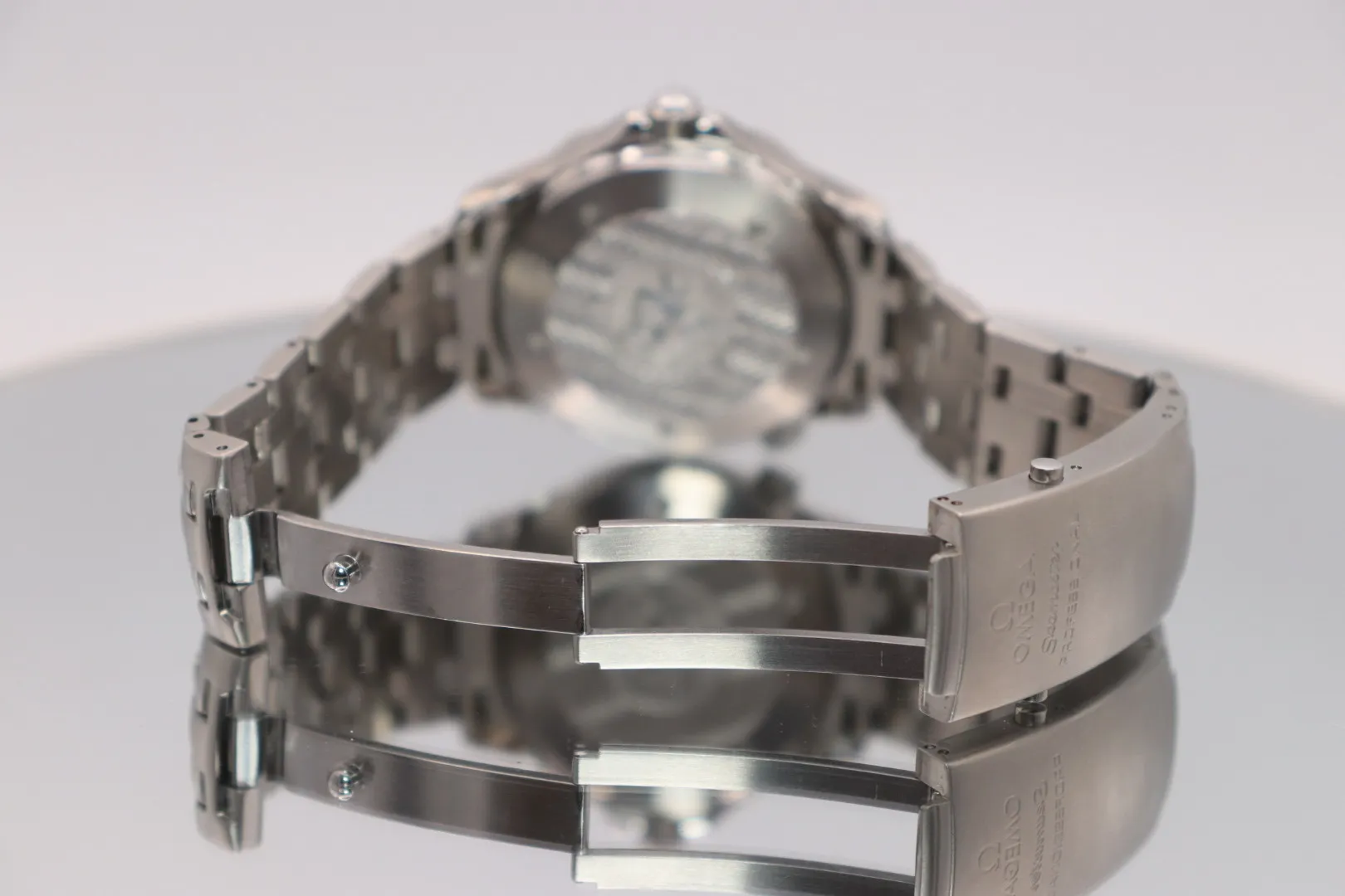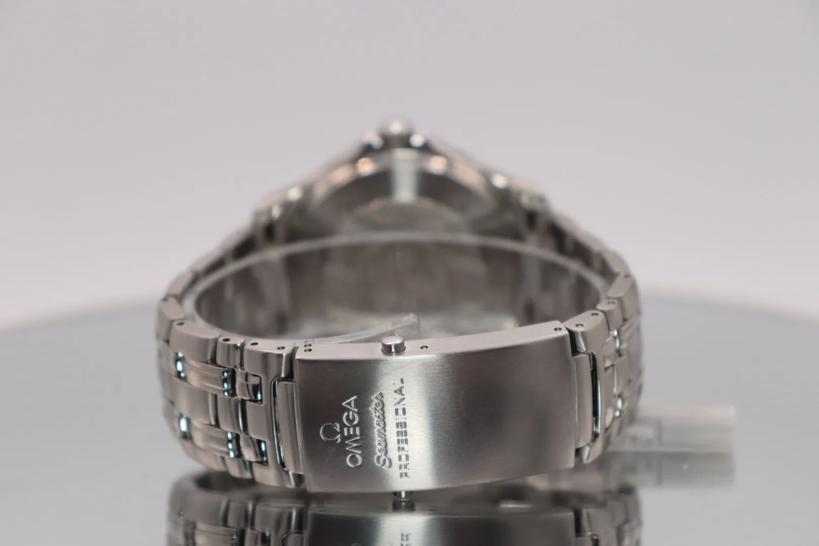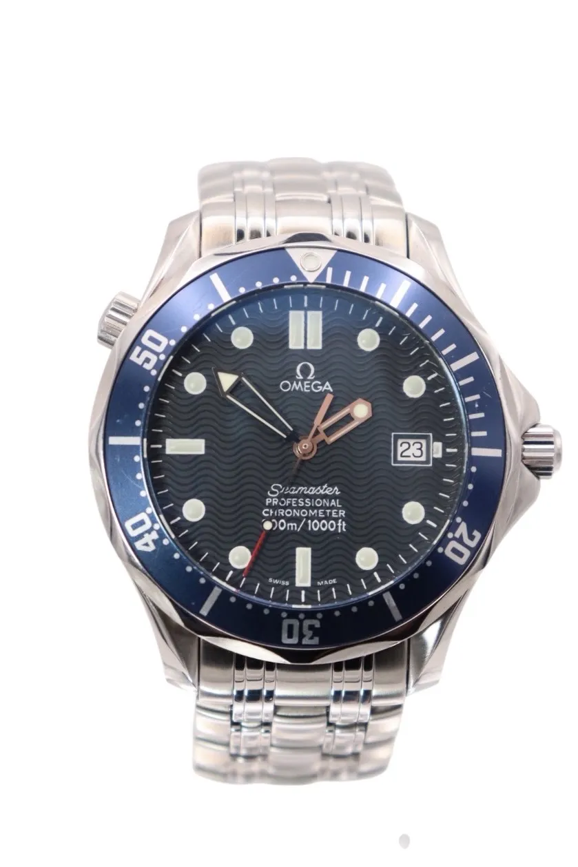 The watch features a 41mm stainless steel case paired with a matching stainless steel bracelet. Its vibrant blue dial displays a wave pattern with luminous hour markers for excellent legibility. The unidirectional rotating bezel and helium escape valve reinforce its professional dive capabilities, while the scratch-resistant sapphire crystal ensures long-term protection. Powered by Omega’s automatic Calibre 1120 movement, the watch delivers precise and reliable timekeeping. This example is in very good overall condition, showing light signs of wear consistent with careful use. Supplied with the original Omega box, the watch has been fully verified via Watch Register and is backed by a 12-month warranty. Specifications