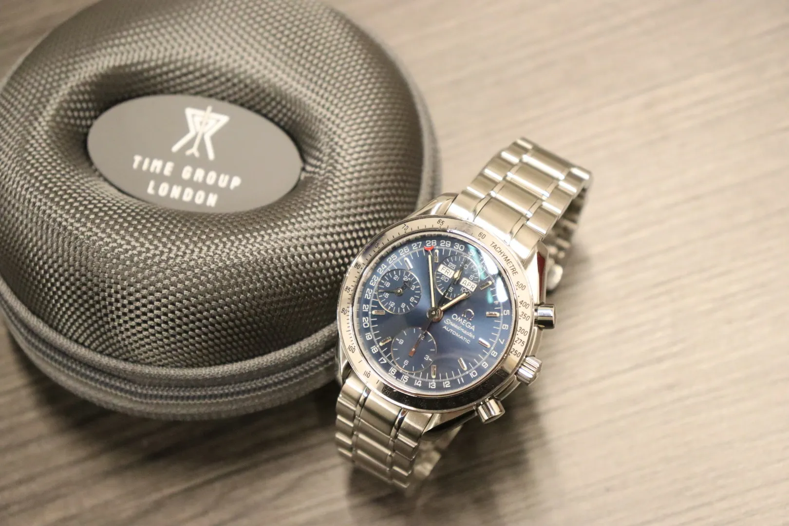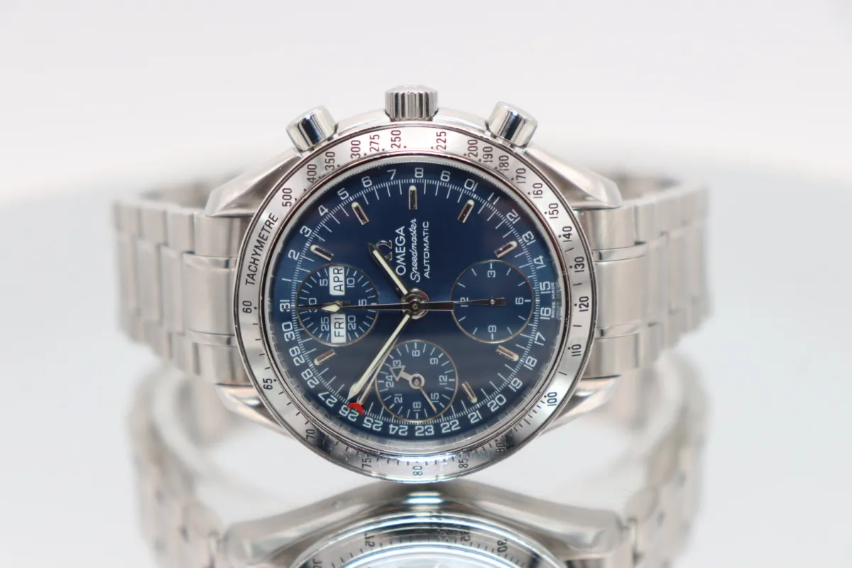 A distinctive and highly functional variation of the legendary Speedmaster, the reference 3523.80.00—often nicknamed the “Day-Date” or “Triple Calendar”—offers far more than traditional chronograph capability. Combining Omega’s racing heritage with practical complications, this model delivers a compelling blend of sportiness and everyday usability.This circa 2005 example features a perfectly proportioned 39mm stainless steel case, paired with a rich blue dial that gives the watch a striking yet refined wrist presence. The dial layout is both technical and elegant, showcasing day and month apertures at 12 o’clock, a central pointer date tracking the outer ring, and chronograph sub-dials for precise timing. Luminous hands and markers ensure excellent legibility, while the tachymeter bezel reinforces its iconic Speedmaster DNA. A domed hesalite crystal further enhances the watch’s vintage character.Powered by the Omega Calibre 1151 automatic movement (based on the robust Valjoux 7751), this timepiece is known for its reliability, serviceability, and multi-functional performance. Finished with a stainless steel bracelet, it offers a comfortable and versatile fit—ideal for both daily wear and more formal occasions.A superb choice for collectors seeking something slightly different within the Speedmaster family, this Triple Calendar stands out for its complexity, charm, and enduring appeal.