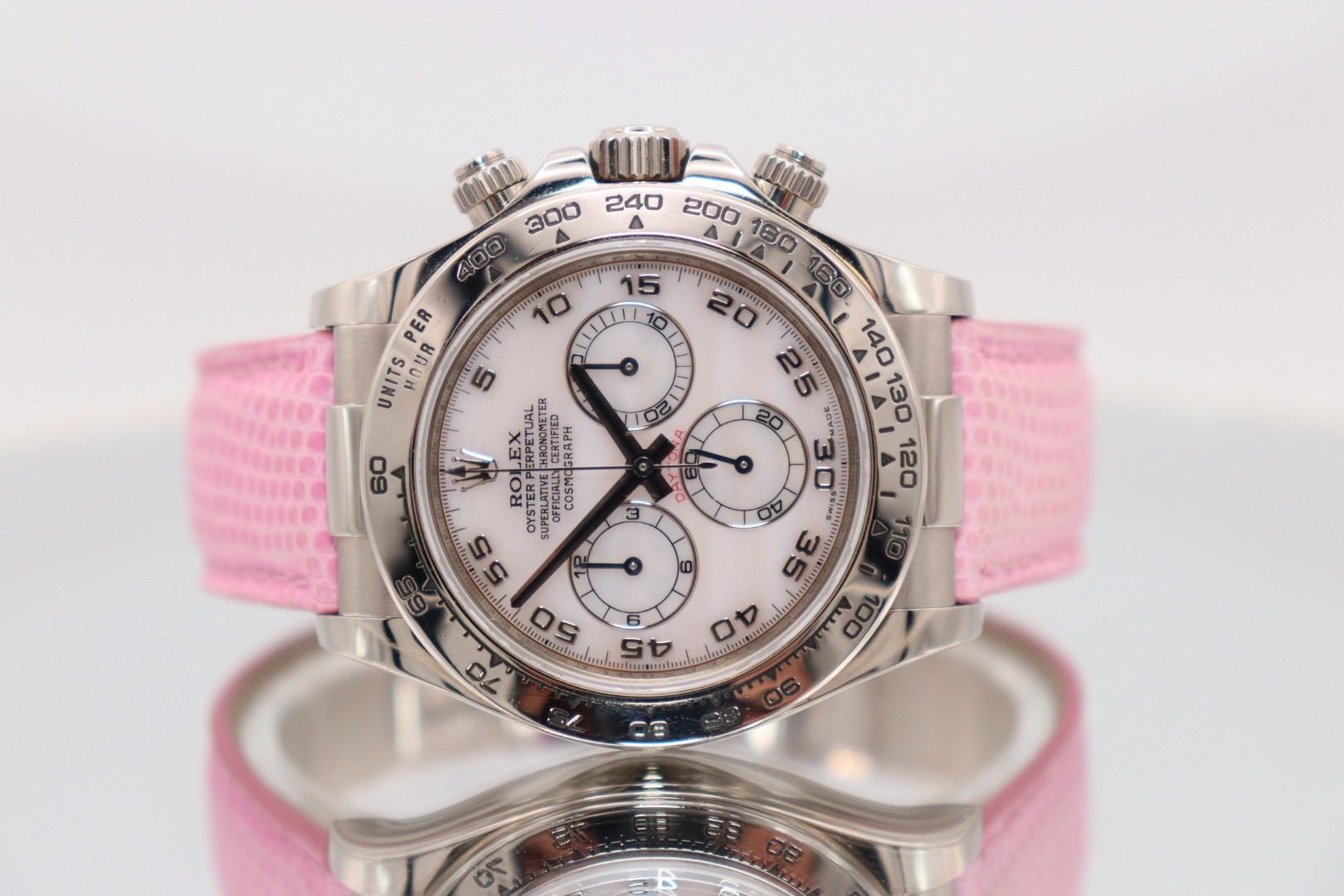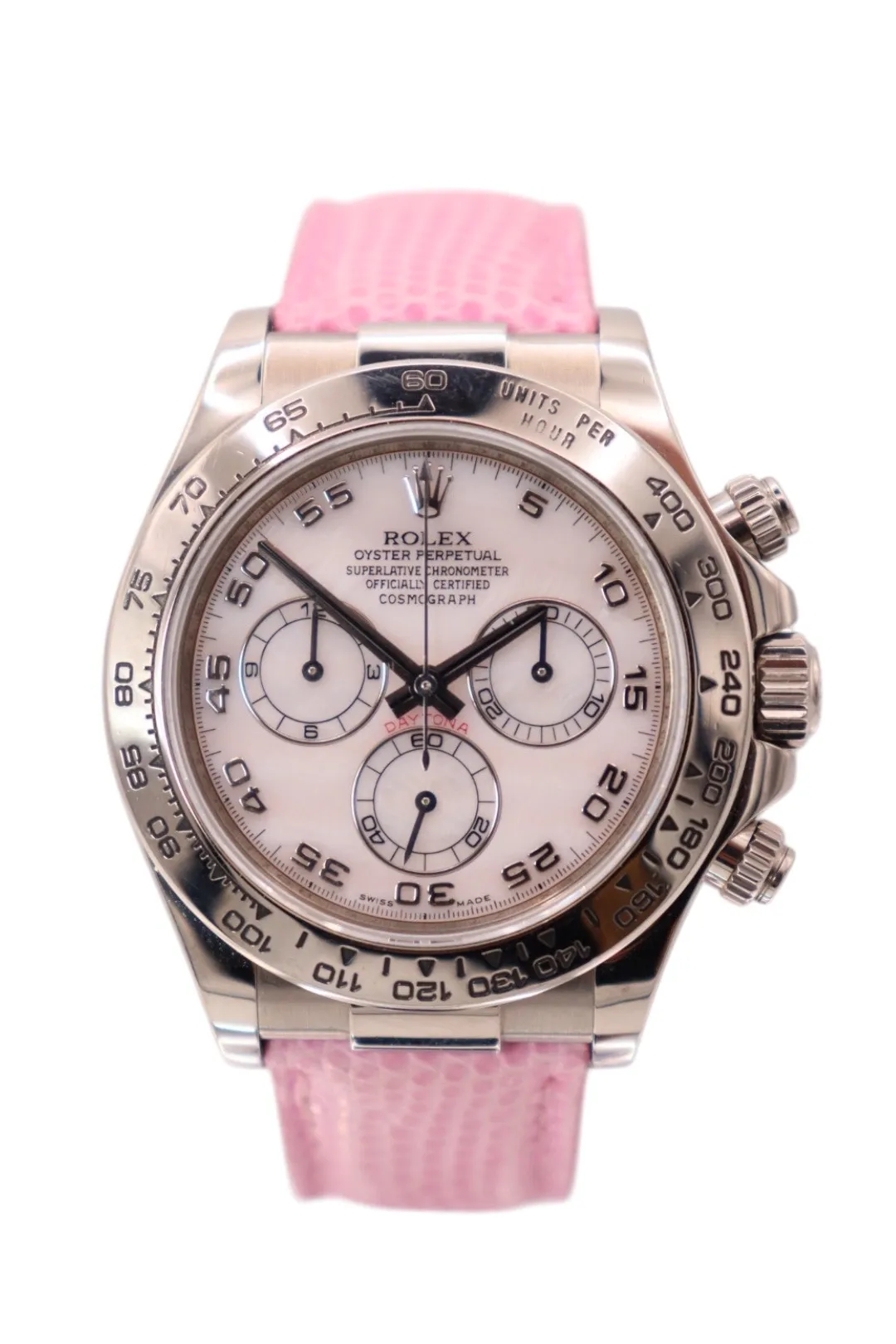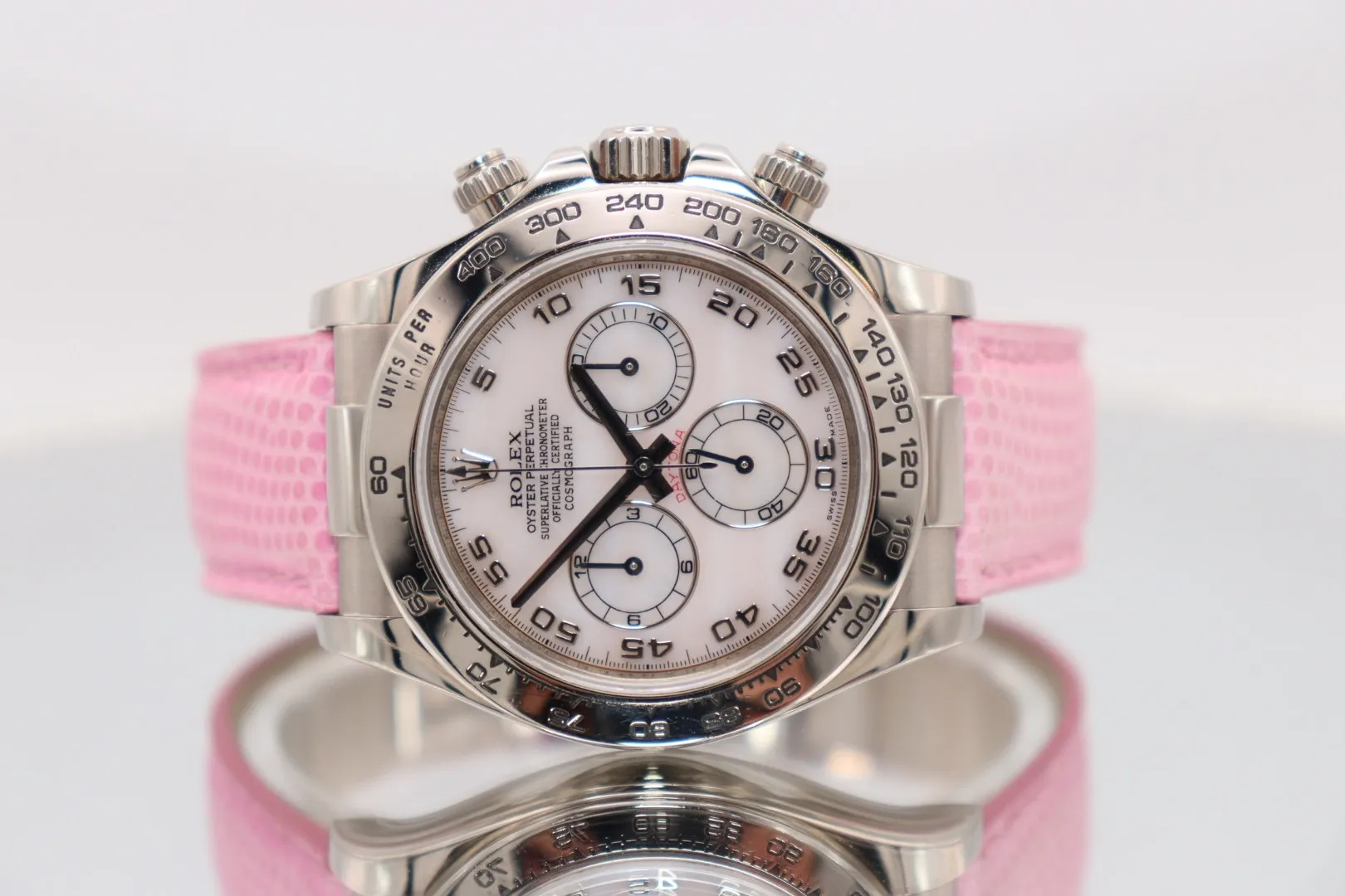 An unmistakable icon of luxury and performance, the Rolex Daytona in 18K white gold represents the pinnacle of precision chronograph watchmaking. This reference 116519 is elevated by a rare and highly attractive pink Mother of Pearl dial, offering a unique play of light that makes each piece truly individual.Crafted from solid 18K white gold, the 40mm case delivers both presence and refinement, complemented by a matching white gold bezel for a clean, elegant finish. The dial is further distinguished by a mix of Roman and Arabic numerals, adding character and exclusivity to this already exceptional timepiece.Powered by Rolex’s renowned automatic chronograph movement, this watch offers outstanding reliability and performance. Finished on a genuine strap, it provides a comfortable and sophisticated fit on the wrist.A highly collectible and visually striking Daytona, ideal for collectors seeking a precious metal model with a rare dial configuration.