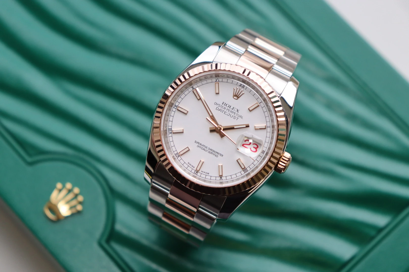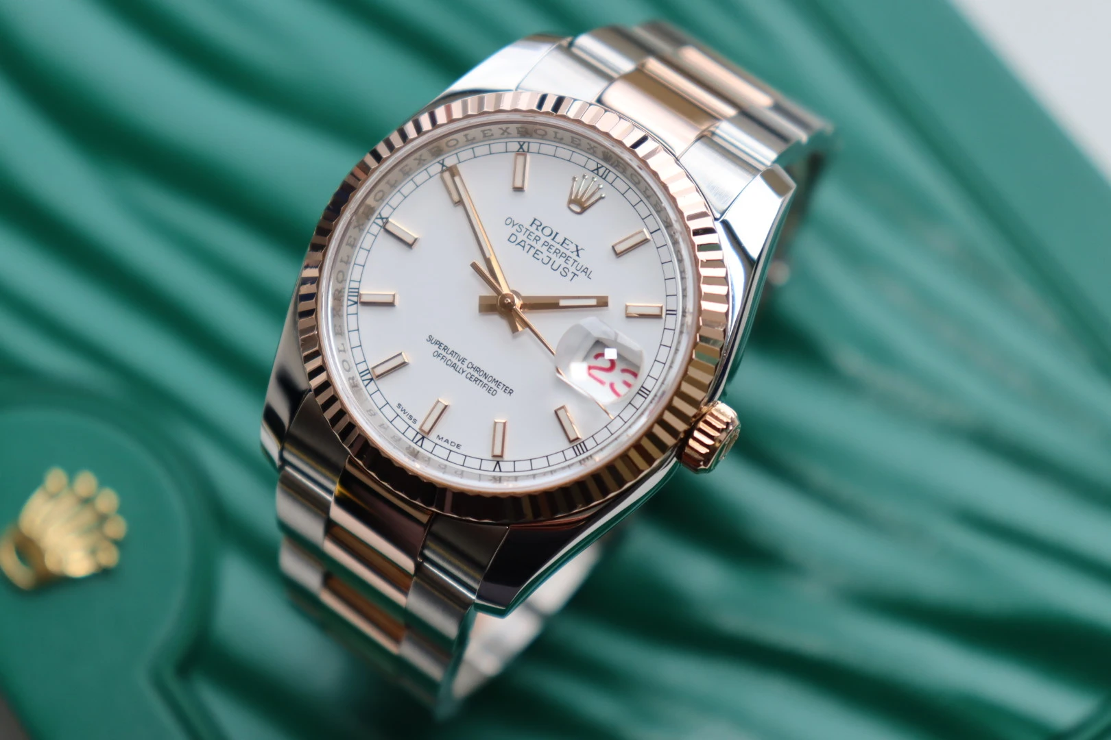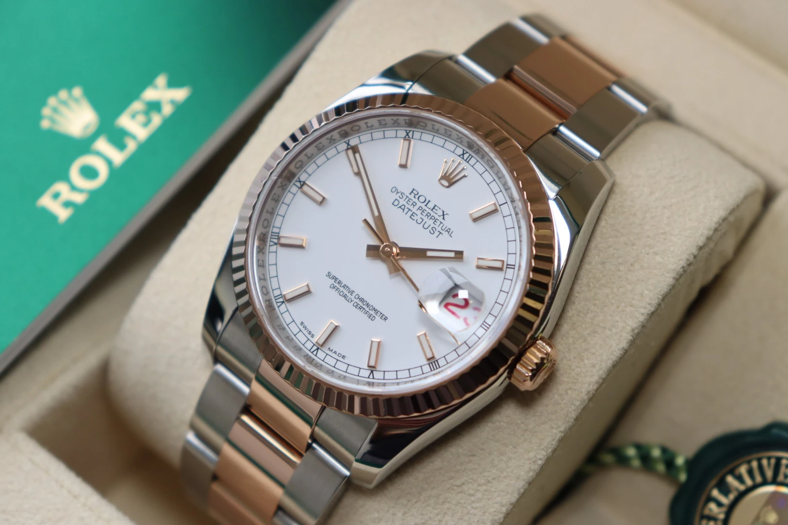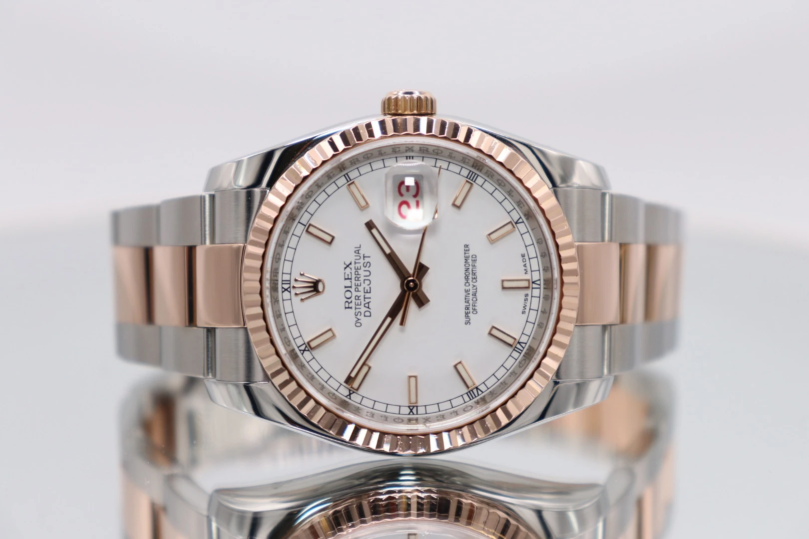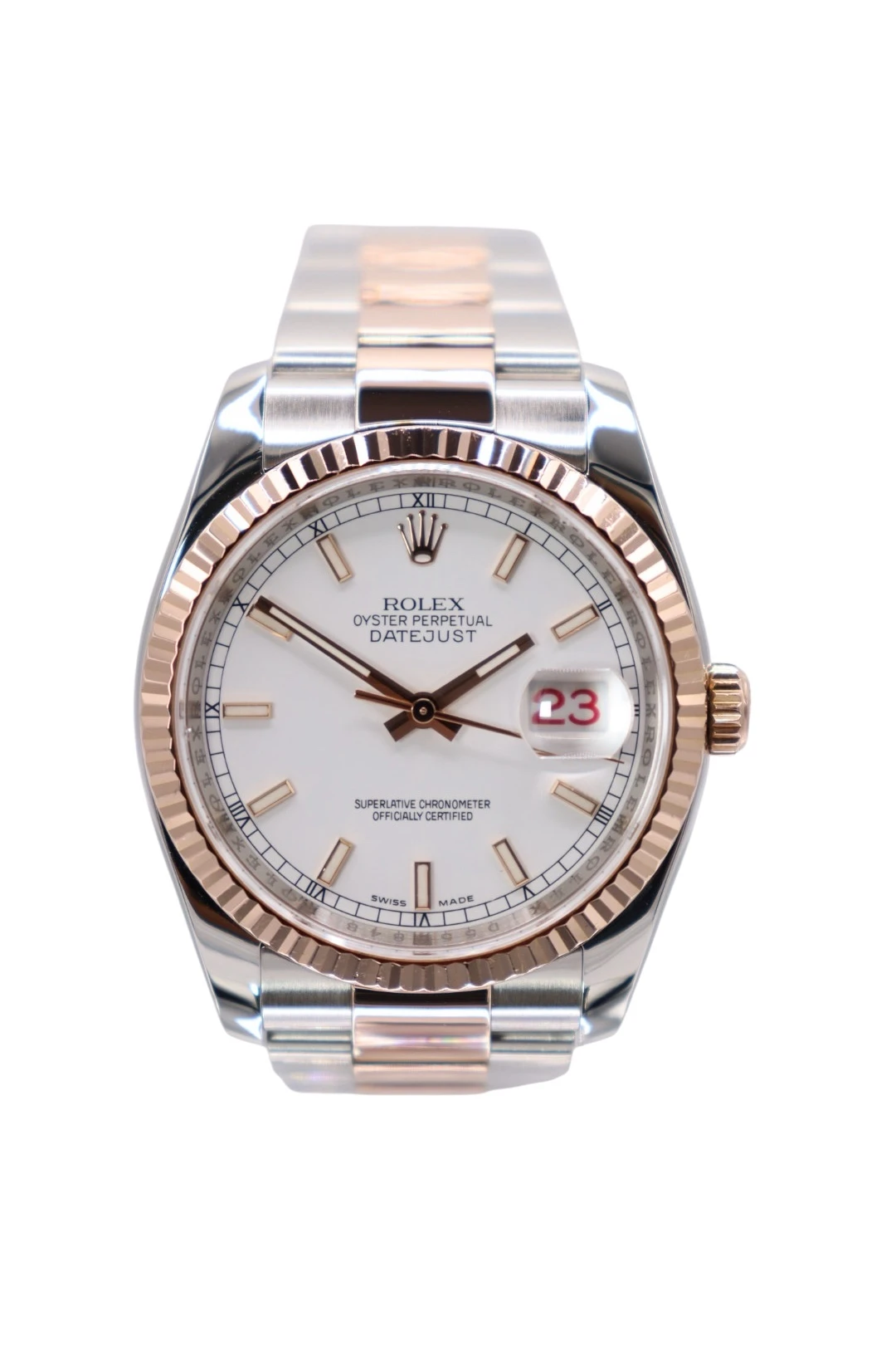 Classic elegance with timeless two-tone style.This Rolex Datejust 36 (ref. 116231) is a perfect blend of durability and refinement, pairing stainless steel with 18K rose gold. The watch features a crisp white dial with baton indexes, framed by a distinctive rose gold fluted bezel. With its versatile 36mm case, it sits beautifully on the wrist, offering a balance of everyday wearability and understated luxury.Includes | Box |