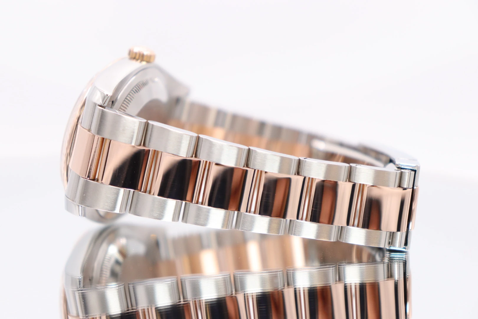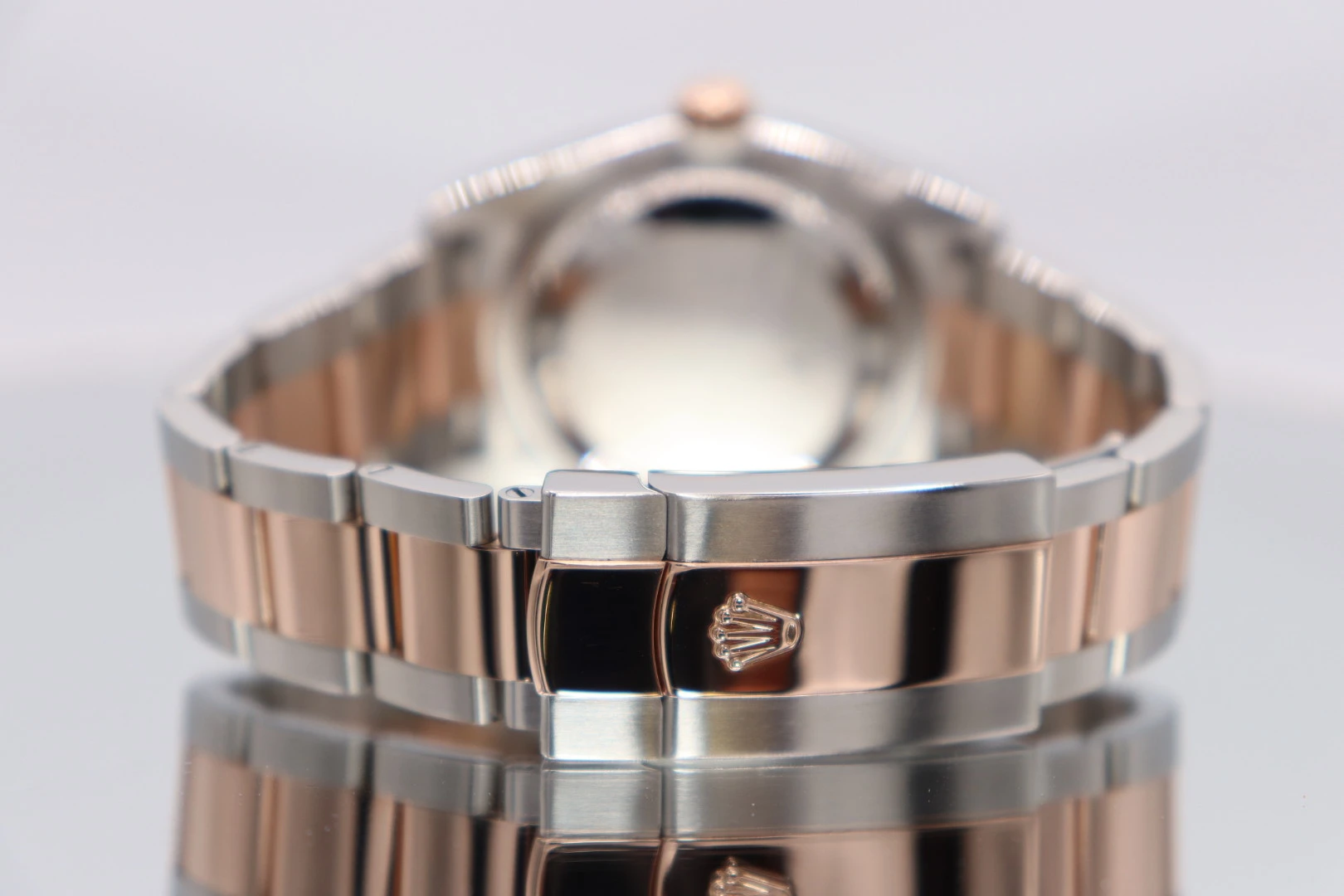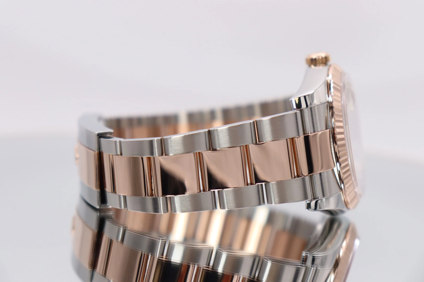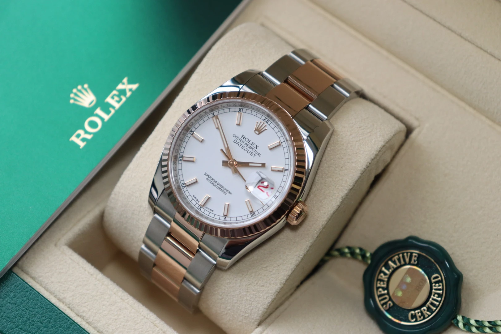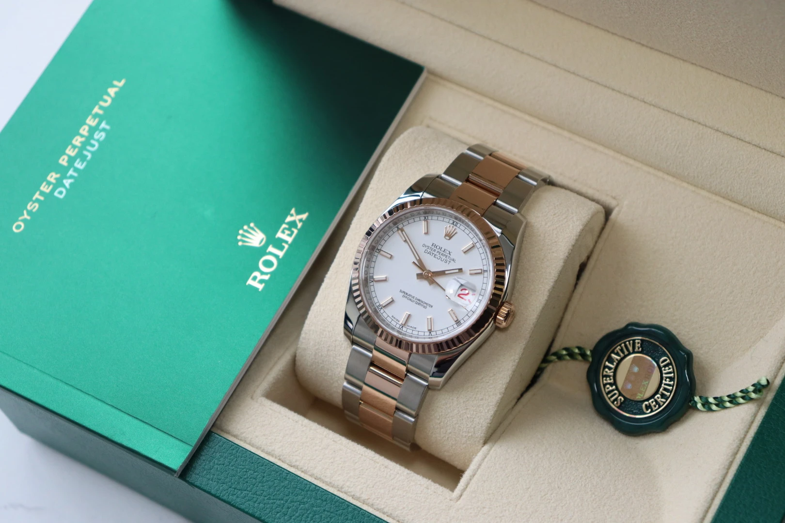 Classic elegance with timeless two-tone style.This Rolex Datejust 36 (ref. 116231) is a perfect blend of durability and refinement, pairing stainless steel with 18K rose gold. The watch features a crisp white dial with baton indexes, framed by a distinctive rose gold fluted bezel. With its versatile 36mm case, it sits beautifully on the wrist, offering a balance of everyday wearability and understated luxury.Includes | Box |