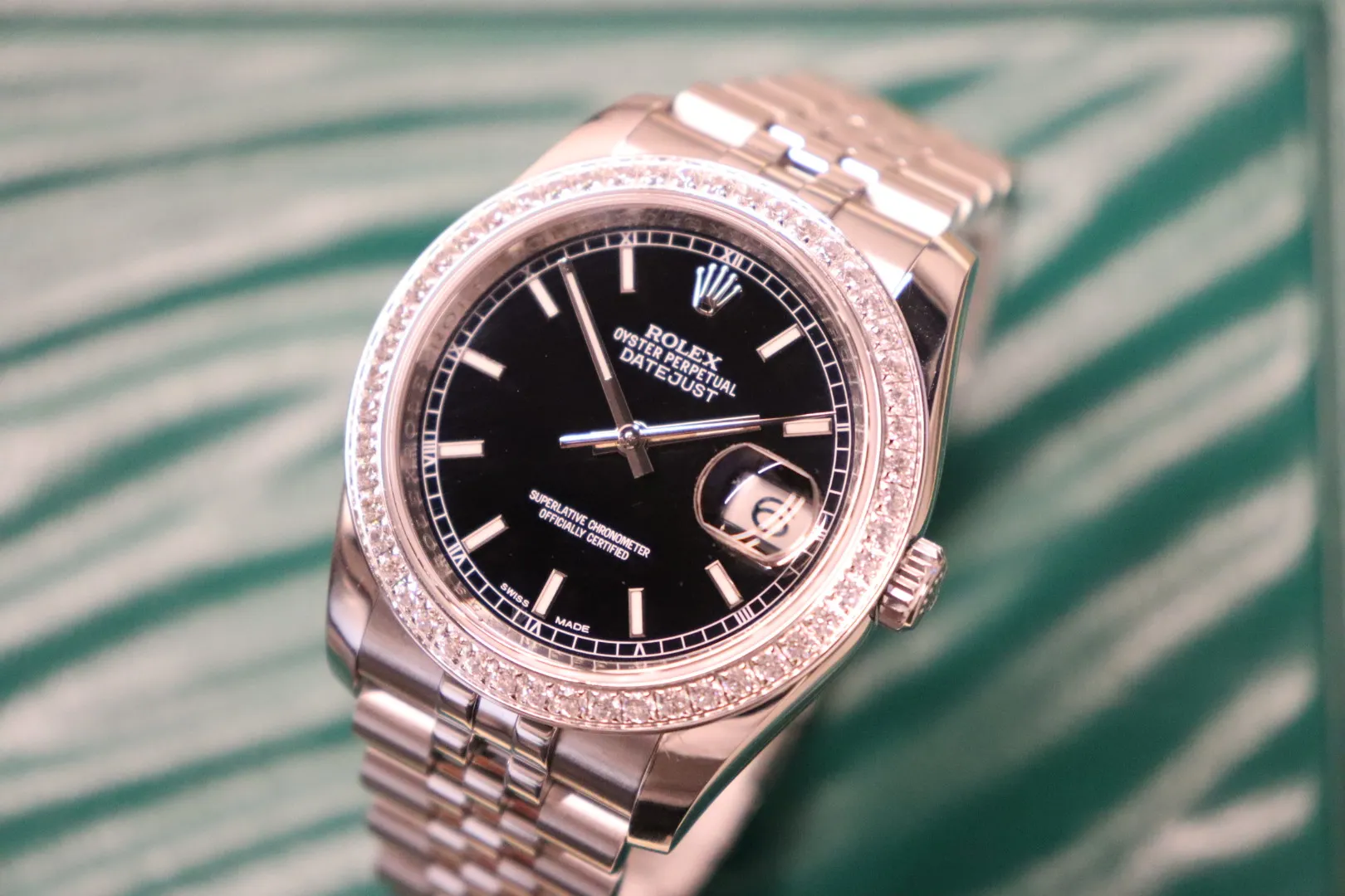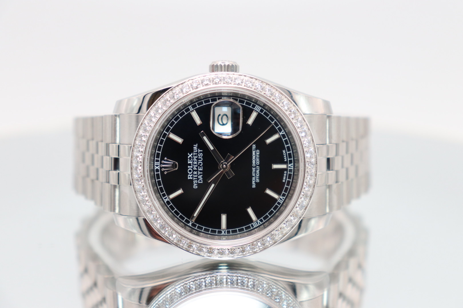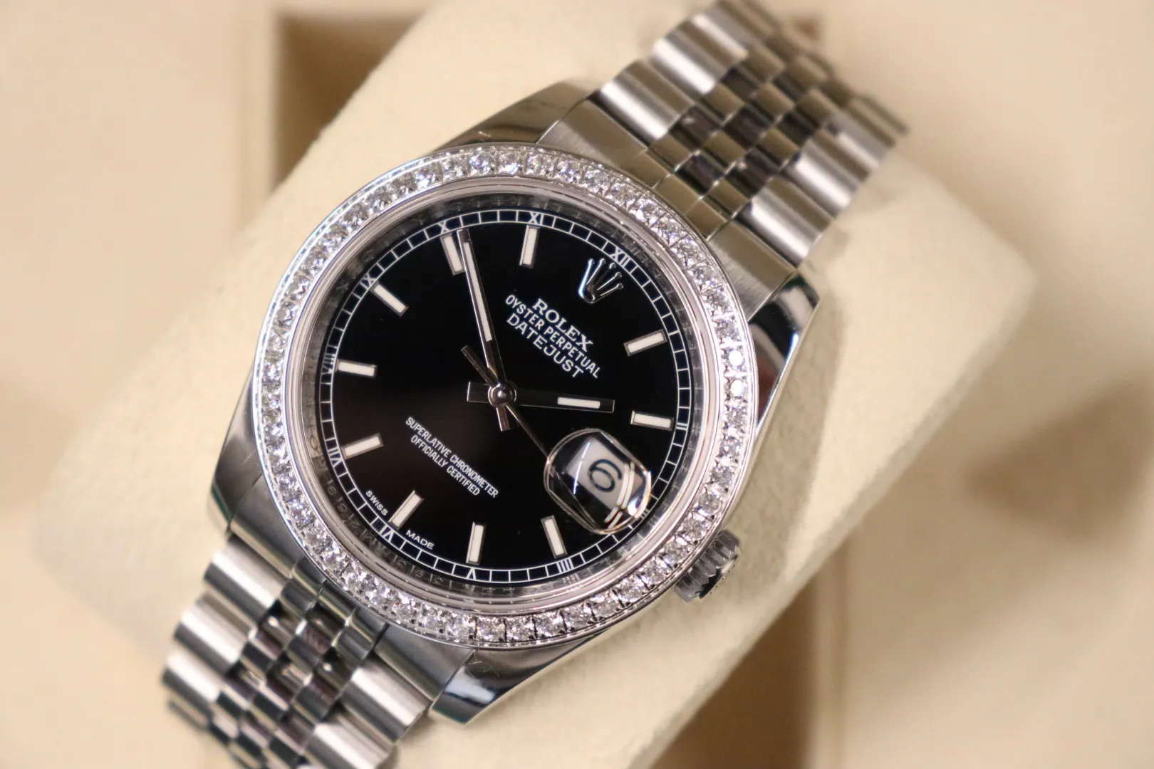 Rolex Datejust 36 Ref. 116200 – Black Dial – Aftermarket Diamond Bezel – 2018 – Full Set Description