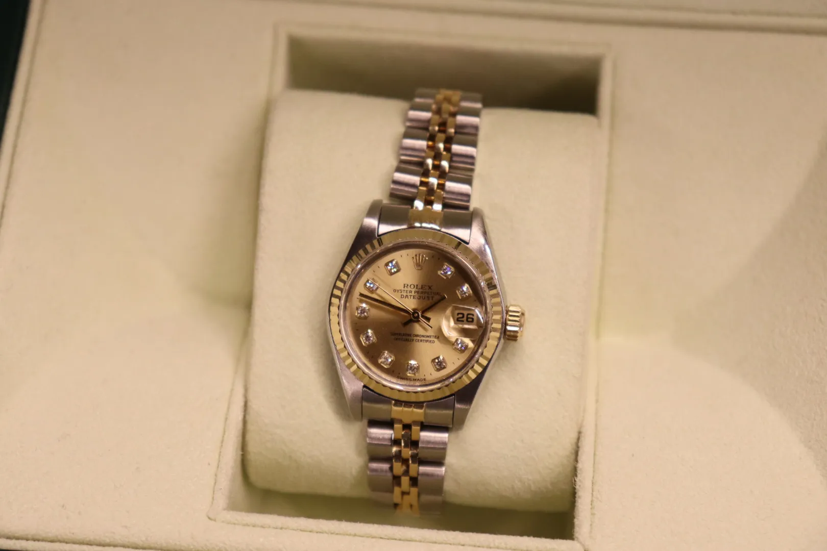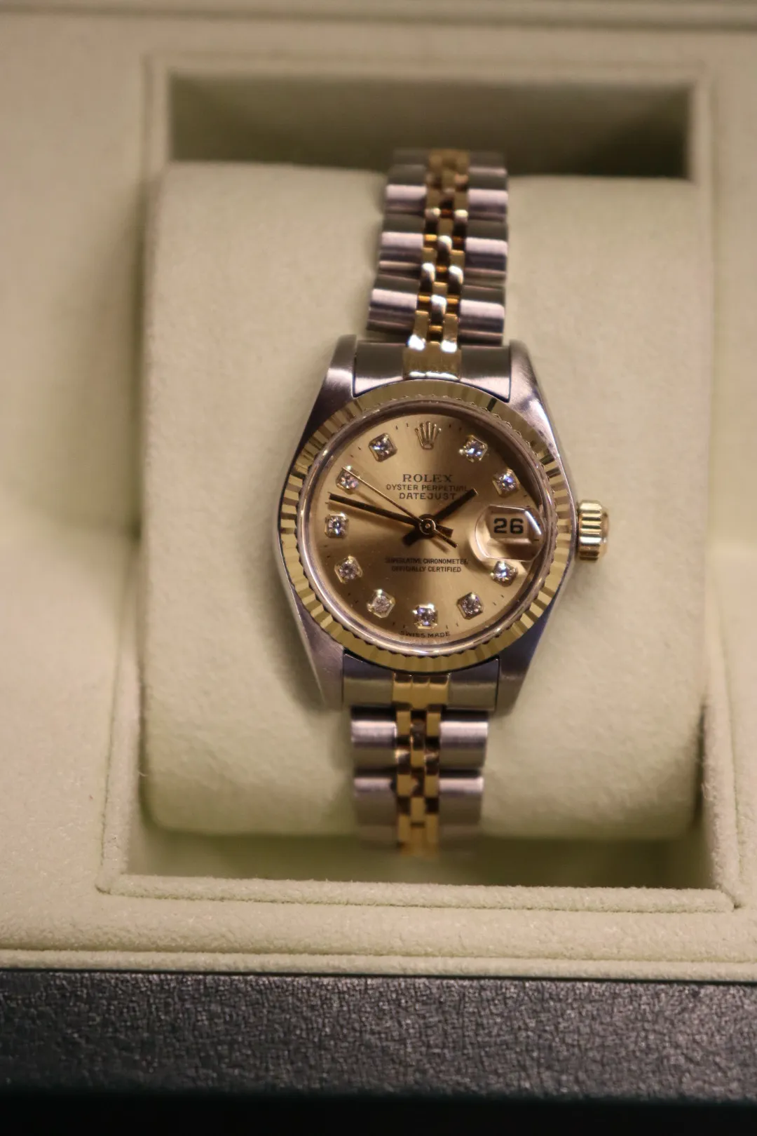 This circa 1985 example features a 26mm stainless steel case paired with an 18ct yellow gold fluted bezel, offering a refined two-tone aesthetic that is both sophisticated and versatile. The iconic champagne dial is enhanced by diamond hour markers, adding a touch of understated luxury while maintaining excellent legibility.