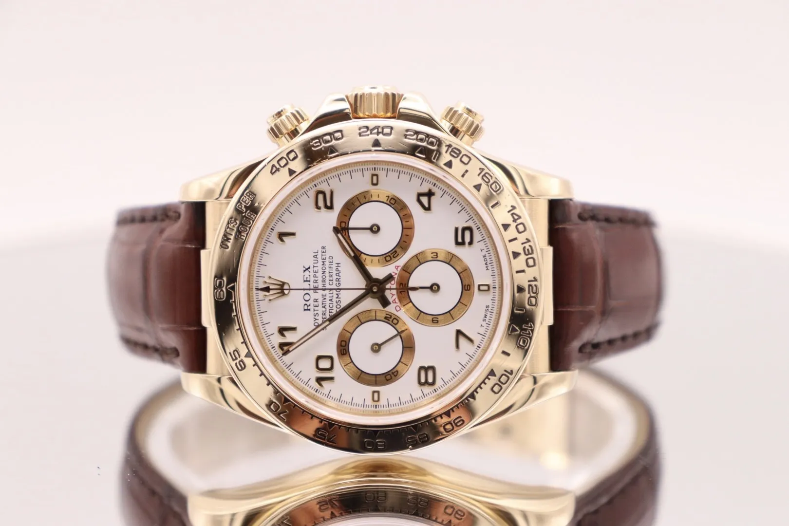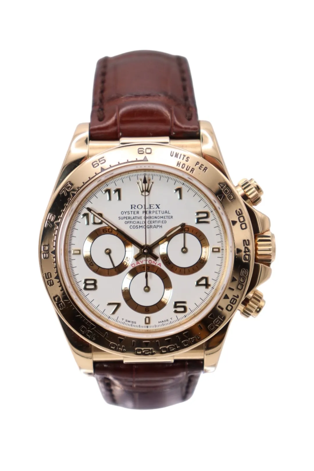 A highly collectible and elegant interpretation of the legendary Daytona, the Rolex Cosmograph Daytona Ref. 16518 blends the iconic chronograph heritage of the Daytona with the warmth and prestige of solid gold. Produced during the revered Zenith-powered era, this reference is particularly sought after by collectors for its historical significance and refined aesthetic.This circa 1996 example features a 40mm case crafted entirely from 18ct yellow gold, paired with a matching 18ct yellow gold tachymeter bezel that delivers the unmistakable Daytona character. The crisp white dial is complemented by bold Arabic numeral hour markers and contrasting chronograph sub-dials, creating a striking and highly legible display.Protected by a scratch-resistant sapphire crystal, the dial remains clear and durable for everyday wear. The watch is fitted to a classic crocodile leather strap, enhancing its luxurious and sophisticated presence on the wrist. Powering the watch is a reliable automatic chronograph movement, renowned for its precision and durability during the celebrated Zenith Daytona generation.Presented in good condition, this example comes with its original Rolex box, has been fully Watch Register checked, and is backed by a 12-month Time Group London warranty for complete peace of mind.