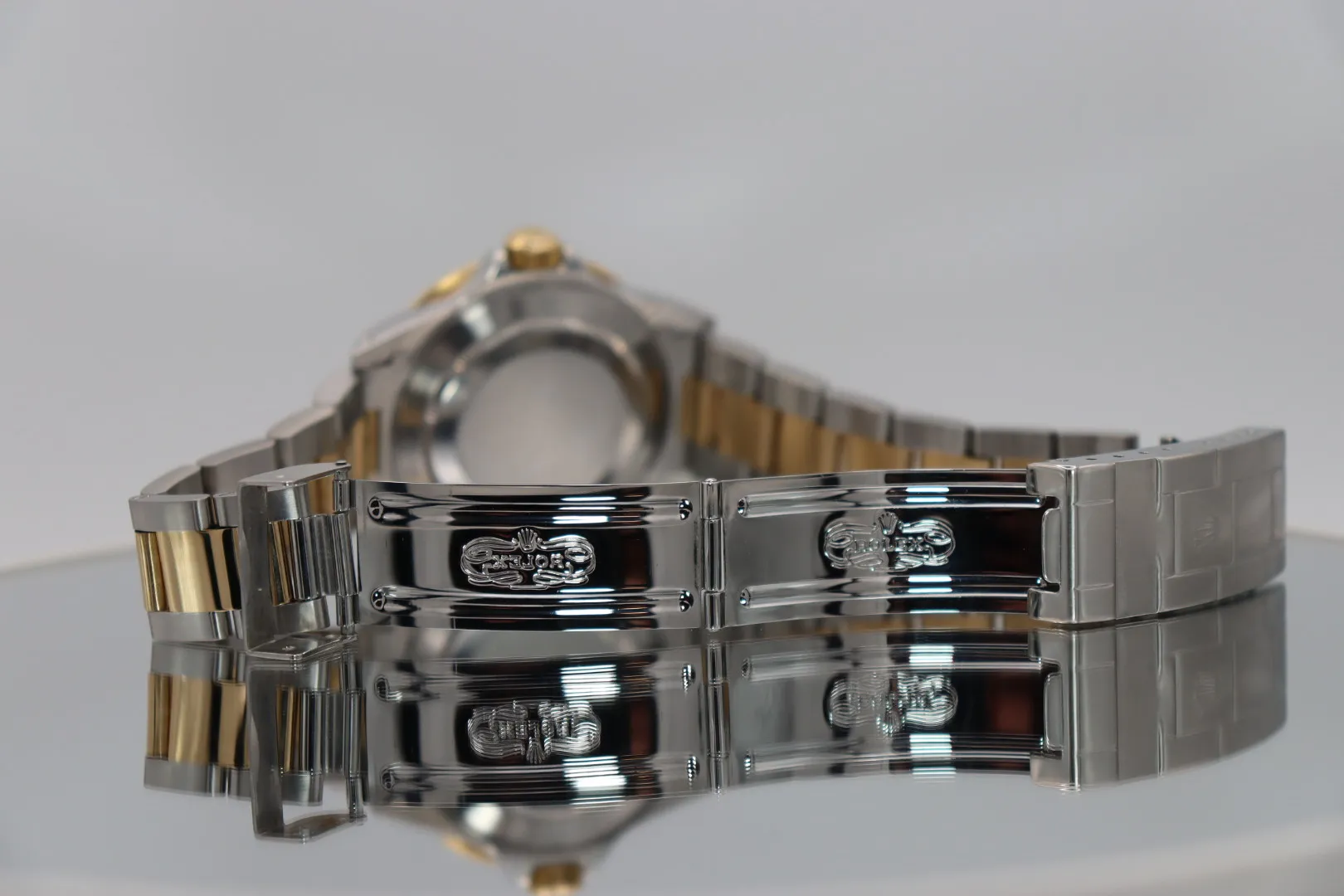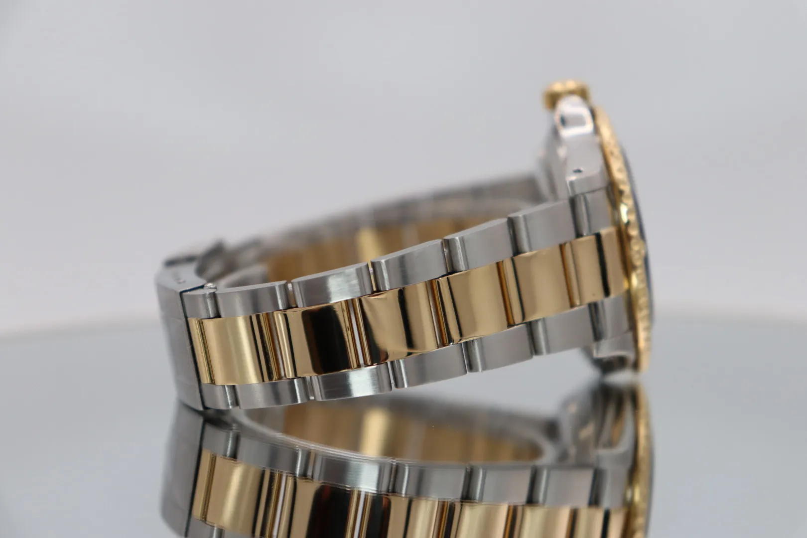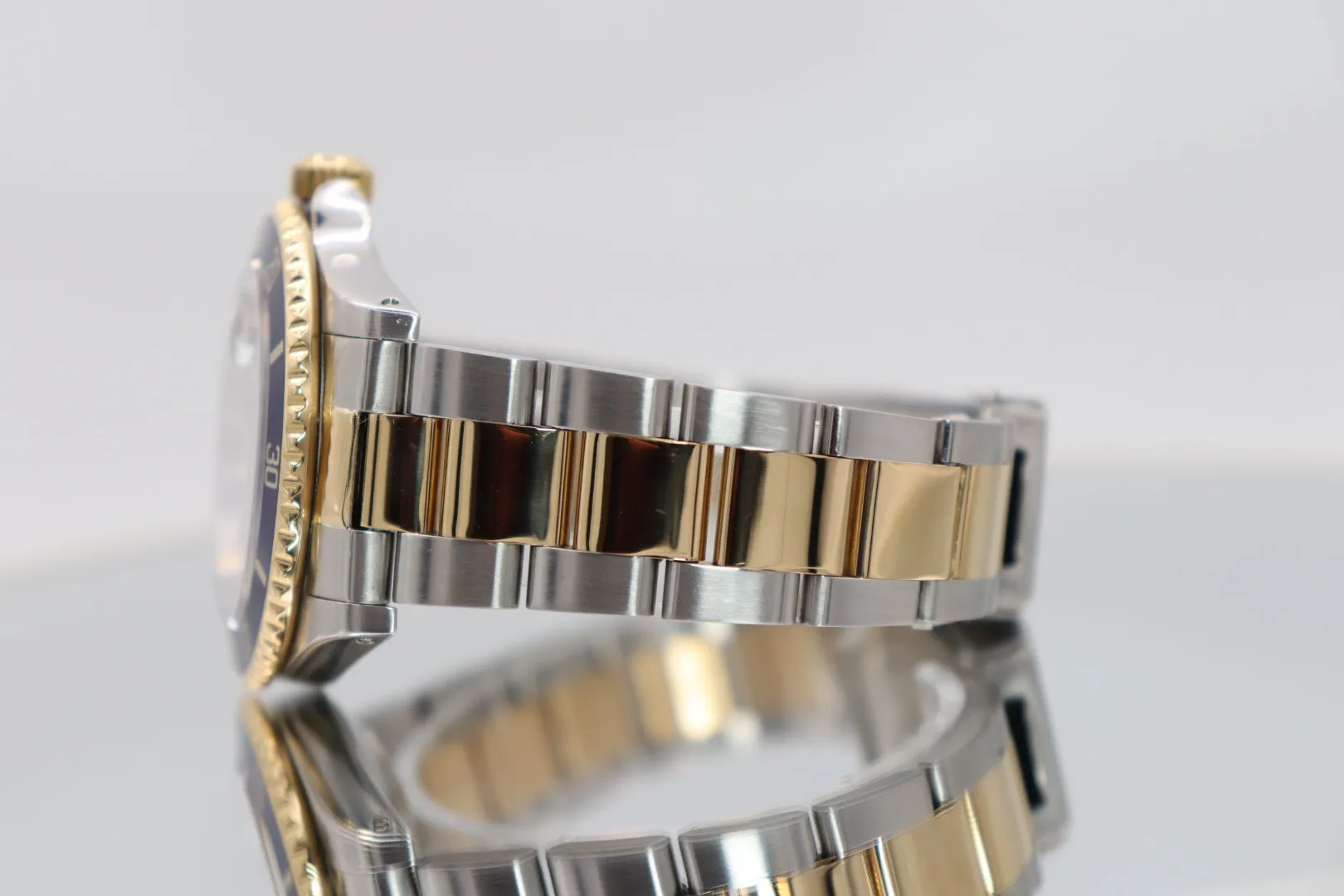 This 2002 example features a 40mm stainless steel case paired with an 18ct yellow gold and steel Oyster bracelet. The blue dial is complemented by matching blue aluminium (pre-ceramic) bezel, giving the watch its distinctive and highly desirable appearance.