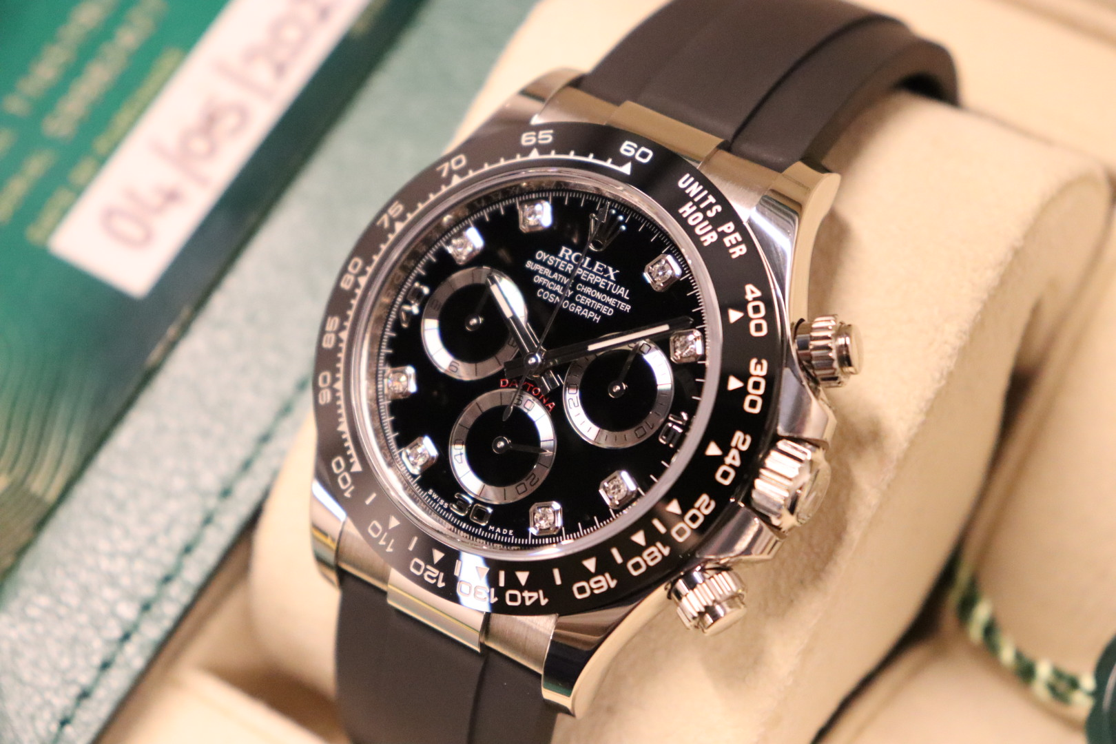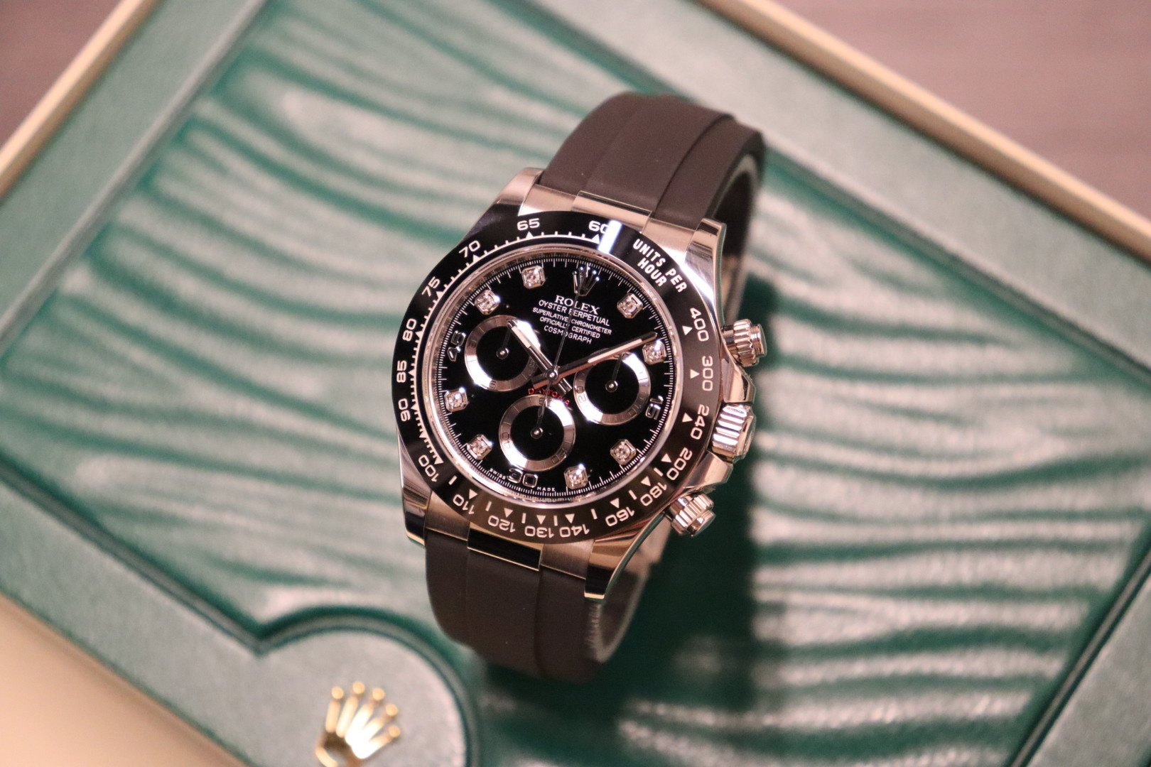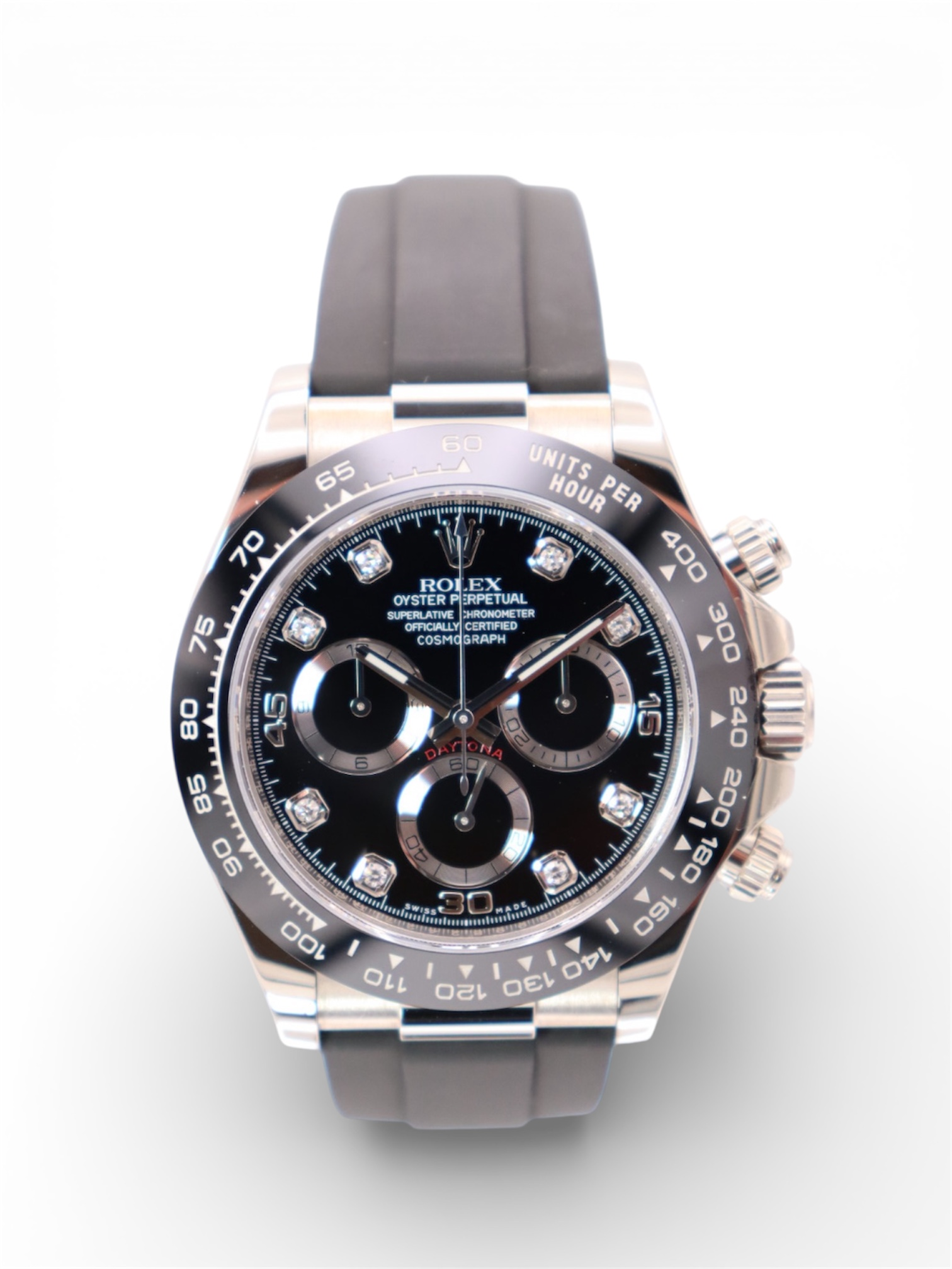 The Rolex Cosmograph Daytona Reference 116519LN is a modern luxury sports chronograph that perfectly balances understated elegance with cutting-edge performance. Crafted in solid 18k white gold and paired with Rolex’s innovative Oysterflex rubber bracelet, this Daytona offers the comfort of rubber with the durability and refinement expected from Rolex.This 2021 example is fitted with a striking black diamond dial, elevating the classic Daytona aesthetic with a discreet yet unmistakable touch of luxury. The black Cerachrom ceramic bezel provides exceptional scratch resistance while maintaining a sharp, contemporary look. Powered by the legendary Rolex calibre 4130, the watch delivers outstanding precision, reliability, and a clean, symmetrical chronograph layout admired by collectors worldwide.Presented in good condition and complete with its original box and papers, this 116519LN is a highly desirable reference for both daily wear and long-term collectability.