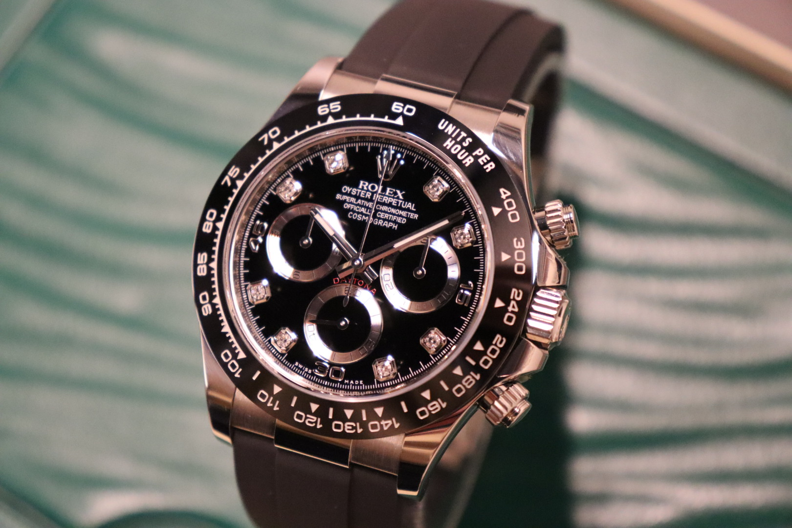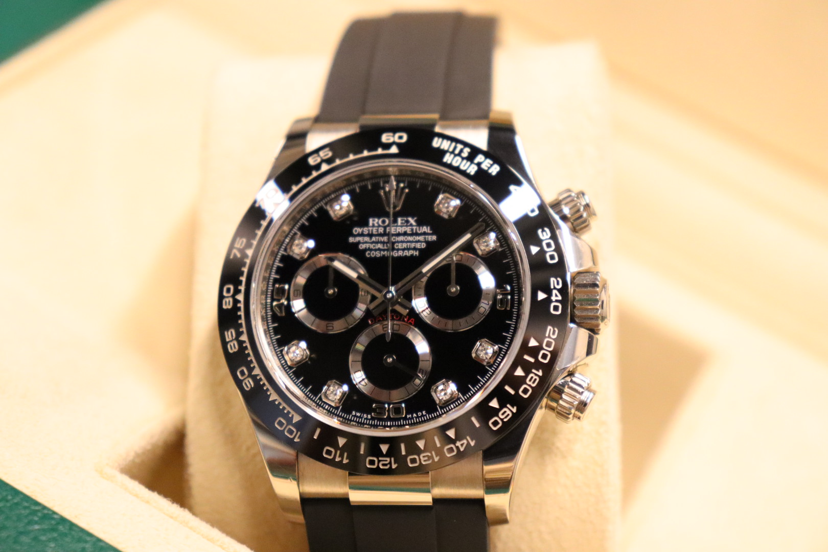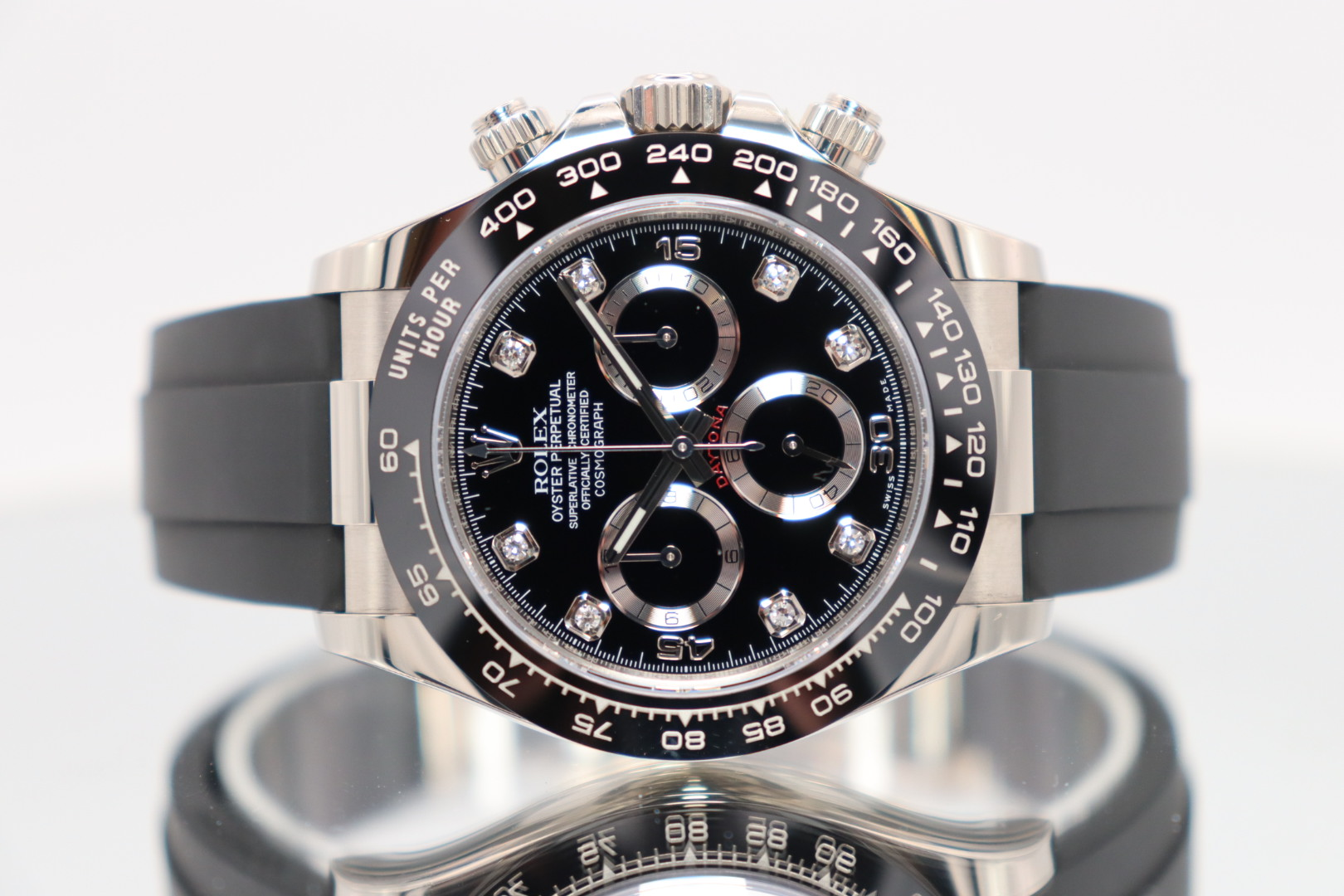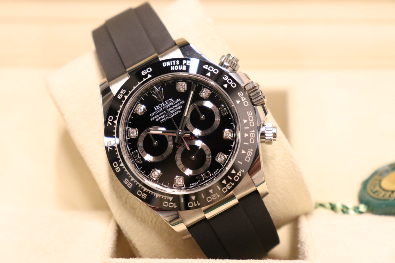The Rolex Cosmograph Daytona Reference 116519LN is a modern luxury sports chronograph that perfectly balances understated elegance with cutting-edge performance. Crafted in solid 18k white gold and paired with Rolex’s innovative Oysterflex rubber bracelet, this Daytona offers the comfort of rubber with the durability and refinement expected from Rolex.This 2021 example is fitted with a striking black diamond dial, elevating the classic Daytona aesthetic with a discreet yet unmistakable touch of luxury. The black Cerachrom ceramic bezel provides exceptional scratch resistance while maintaining a sharp, contemporary look. Powered by the legendary Rolex calibre 4130, the watch delivers outstanding precision, reliability, and a clean, symmetrical chronograph layout admired by collectors worldwide.Presented in good condition and complete with its original box and papers, this 116519LN is a highly desirable reference for both daily wear and long-term collectability.