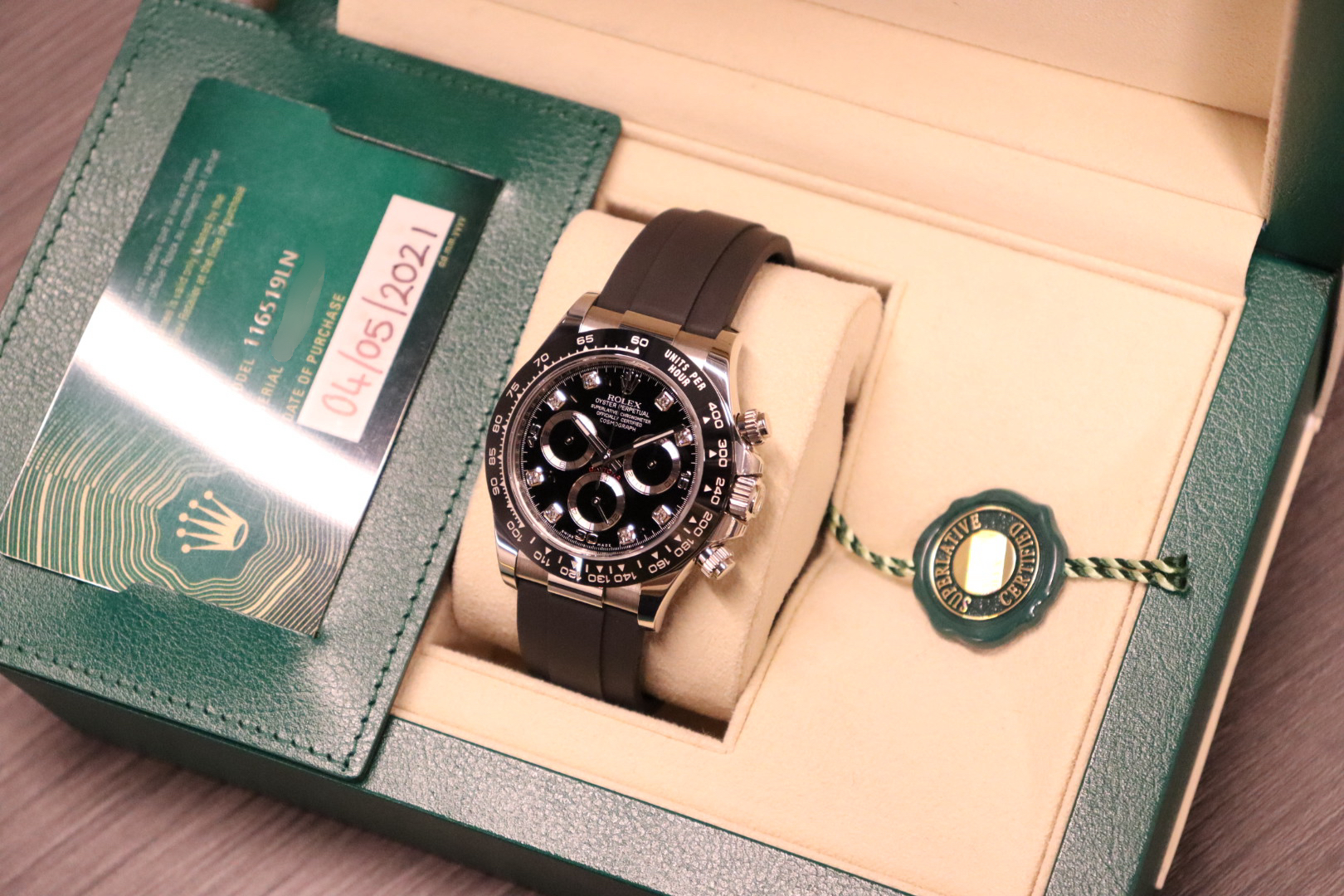 Rolex Cosmograph Daytona – 116519LN – 40mm – 18k White Gold – Black Diamond Dial – 2021Description