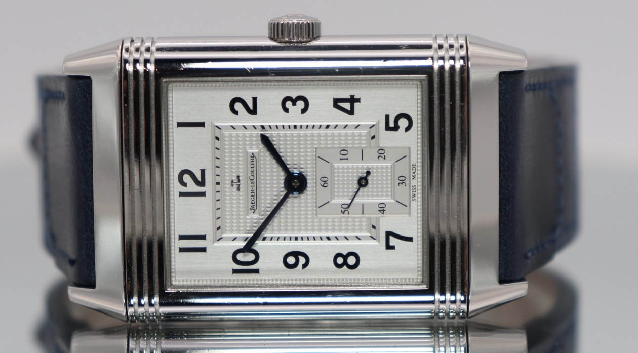 A true icon of Swiss watchmaking, the Jaeger-LeCoultre Grande Reverso 976 reference Q3738420 is a timeless expression of Art Deco design and mechanical excellence. Instantly recognisable for its signature reversible case, this elegant timepiece was originally created for polo players and has since become one of the most celebrated dress watches in horology.Crafted in stainless steel, the rectangular 30mm case houses a refined silver guilloché dial with bold Arabic numerals and a small seconds sub-dial, offering a beautifully balanced and highly legible display. The iconic Reverso case allows the watch head to slide and flip, revealing the solid steel reverse — a hallmark feature of the collection.Powered by the in-house Jaeger-LeCoultre Calibre 976 manual-winding movement, this watch delivers exceptional craftsmanship, reliability, and traditional mechanical charm. Presented in good condition, this 2015 example is supplied with its original box and papers, has been Watch Register checked for authenticity, and is fitted with a new blue leather strap purchased directly from the Jaeger-LeCoultre boutique. It is backed by a 12-month warranty for complete peace of mind.