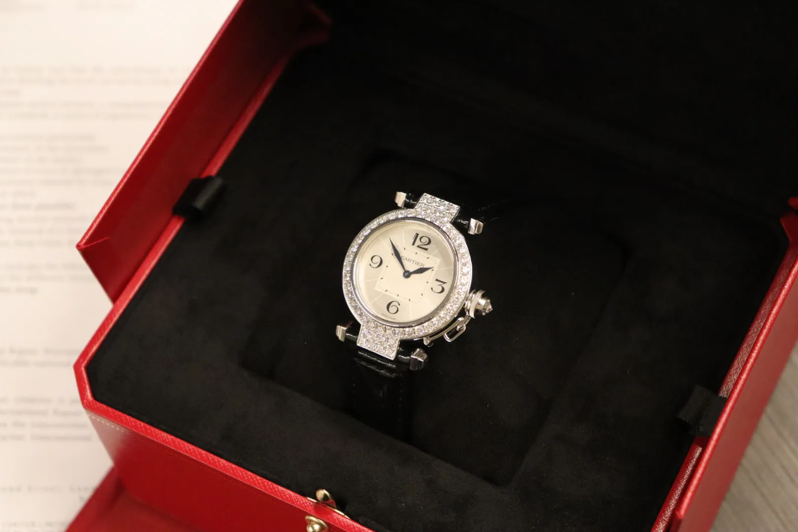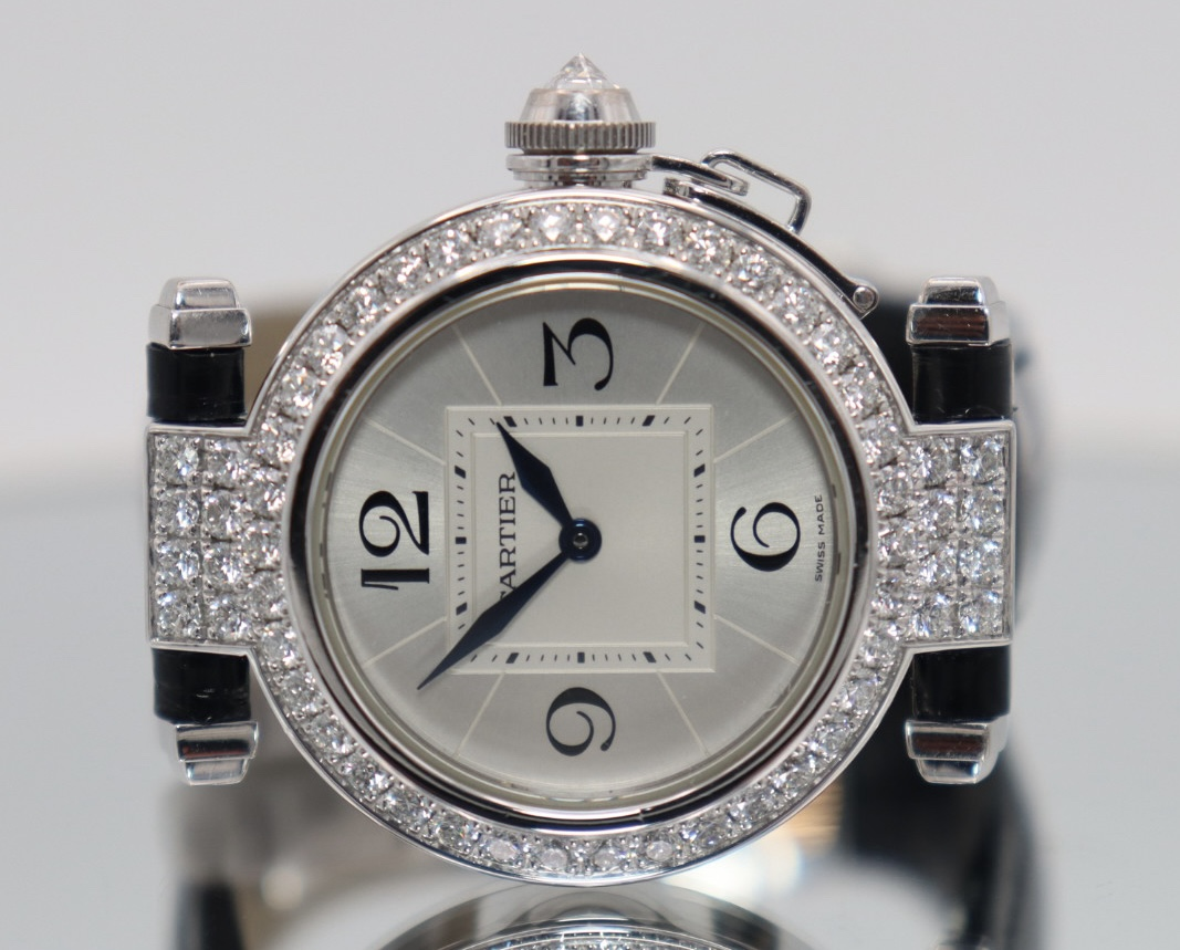 Elegant, distinctive, and unmistakably Cartier, this Cartier Pasha reference 2813 is a refined expression of the maison’s iconic design language. Crafted in luxurious 18k white gold, the Pasha’s signature rounded case and bold proportions make it a timeless statement piece with enduring appeal.Measuring 32mm, this model features a classic silver/white dial adorned with bold Arabic numeral hour markers, delivering excellent legibility and strong character. The case is further elevated by a factory diamond-set bezel, adding a subtle brilliance while maintaining Cartier’s hallmark elegance. A sapphire crystal protects the dial, while the reliable quartz movement ensures precise, low-maintenance timekeeping.Presented in good condition, this watch is supplied with its original Cartier box and is accompanied by Cartier service papers dated 2026, offering additional reassurance. The watch has been fully verified via Watch Register and is backed by a 12-month Time Group London warranty for complete peace of mind.