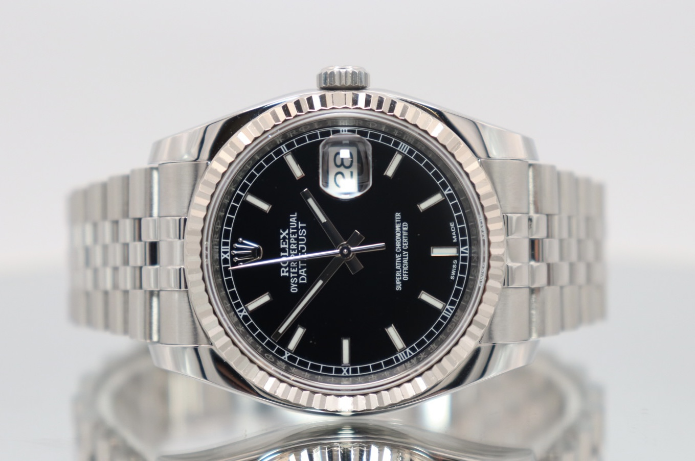 A modern classic with a subtle vintage twist, this Rolex Datejust 36 reference 116234 features the highly desirable “Roulette” date wheel, where the date alternates between red and black numerals — a nod to classic Rolex Datejusts of the past and a favourite detail among collectors.Crafted in stainless steel and measuring the timeless 36mm case size, this reference is distinguished by its elegant 18k white gold fluted bezel, adding refined contrast and unmistakable Rolex character. The sleek black dial is complemented by clean baton hour markers, offering excellent legibility and a perfectly balanced aesthetic suitable for both formal and everyday wear.Powered by the highly regarded Rolex Calibre 3135 automatic movement, the Datejust delivers outstanding reliability, precision, and everyday practicality. A sapphire crystal protects the dial, while the iconic Cyclops lens magnifies the date display.Presented in good condition, this 2015 example is supplied with its original Rolex box and papers, has been fully verified via Watch Register, and is backed by a 12-month Time Group London warranty for complete peace of mind.