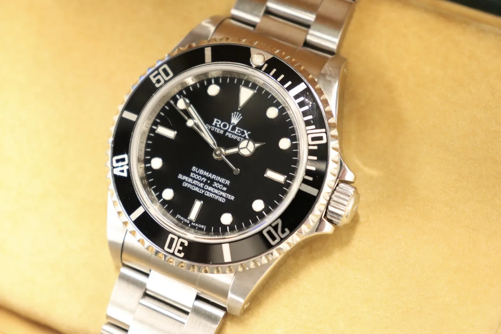 A true purist’s dive watch, this Rolex Submariner reference 14060M represents one of the last of the classic no-date Submariner models, prized by collectors for its clean dial layout and traditional tool-watch character. Combining rugged capability with timeless design, the 14060M remains one of the most respected modern vintage Submariners.This example features a 40mm stainless steel Oyster case with a pre-ceramic unidirectional dive bezel, preserving the classic aluminium insert look beloved by enthusiasts. The black dial is fitted with rounded luminous hour markers and Mercedes hands for exceptional legibility in all lighting conditions. A sapphire crystal protects the dial, while the Rolex automatic movement delivers robust and reliable performance.Presented in good condition, this watch is supplied with its original box, has been Watch Register checked, and is backed by a 12-month TGL warranty for complete peace of mind.