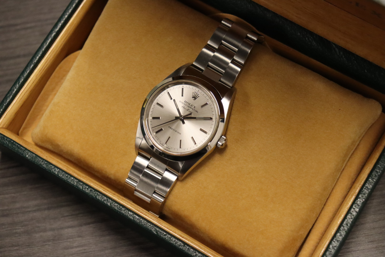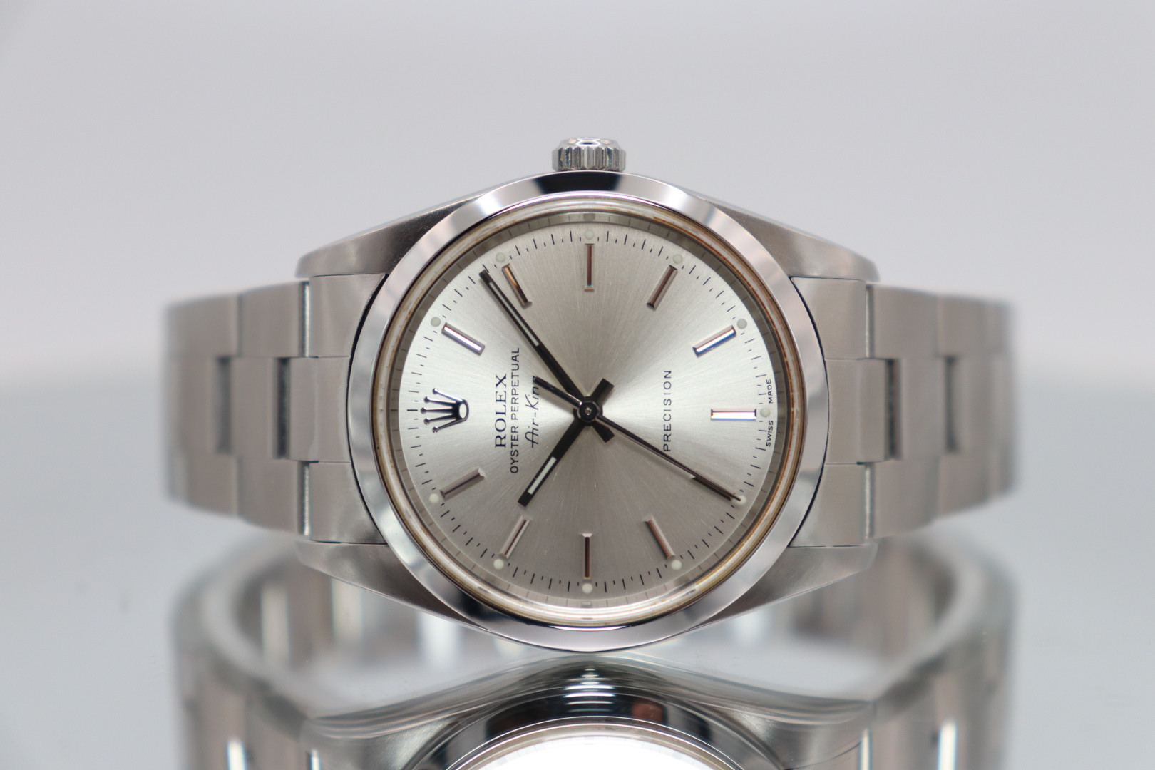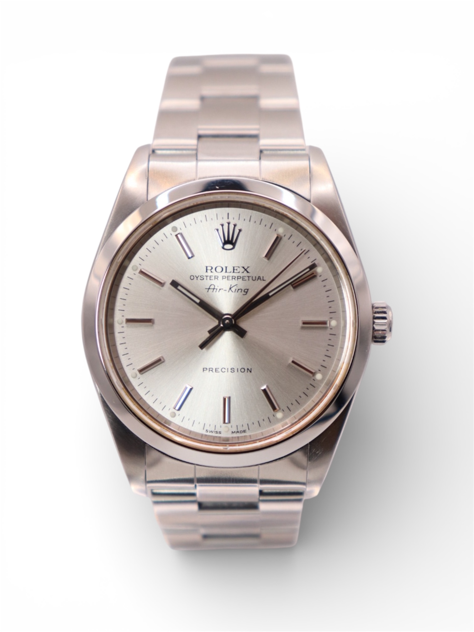 Rolex Air-King 34mm Stainless Steel Silver Dial – Ref. 14000M (Circa 2003)A timeless and understated classic, the Rolex Air-King reference 14000M represents Rolex’s heritage of precision aviation watches in its purest, most wearable form. Clean, versatile, and built to Rolex’s legendary standards, the Air-King remains a favourite among collectors seeking an elegant everyday Rolex.This circa 2003 example features a 34mm stainless steel Oyster case paired with a smooth polished bezel, giving the watch a refined and balanced presence on the wrist. The silver dial is fitted with clean baton hour markers, offering excellent legibility and a minimalist aesthetic. Protected by a sapphire crystal, the dial maintains its clarity and durability, while the stainless steel Oyster bracelet ensures comfort and robustness for daily wear.Powered by a reliable automatic Rolex movement, the Air-King delivers dependable performance and long-term durability. Presented in good condition, this watch is supplied with its original Rolex box, has been fully Watch Register checked, and is backed by a 12-month Time Group London warranty for complete peace of mind.