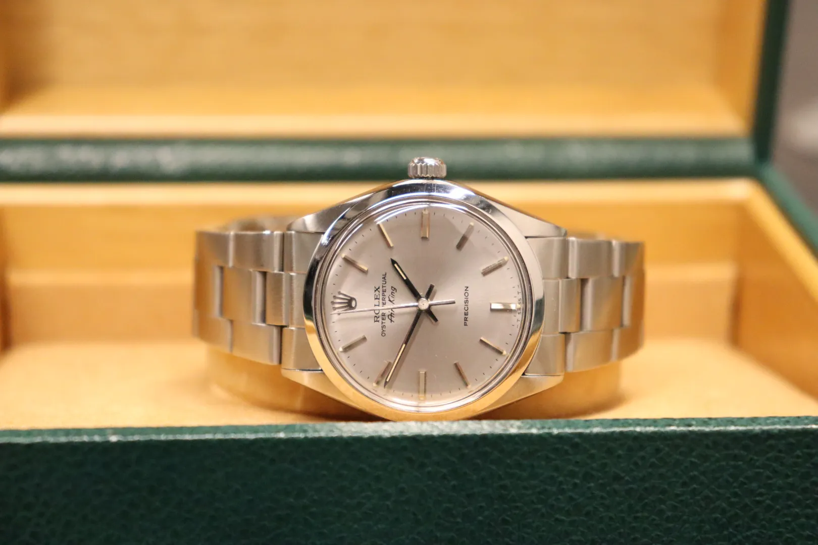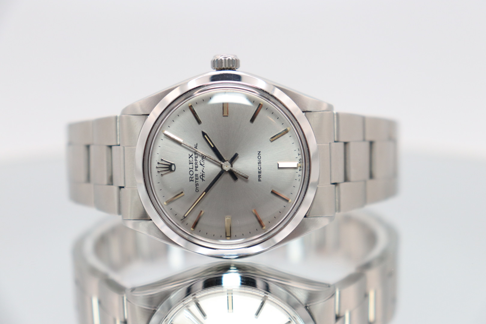Rolex Air-King 34mm Silver Dial – Ref. 5500 (1978) A true vintage classic, the Rolex Air-King Ref. 5500 represents one of the longest-running and most iconic models in Rolex history. Known for its clean design and everyday versatility, the Air-King has remained a staple for collectors seeking understated vintage Rolex charm. This 1978 example features a 34mm stainless steel case paired with a smooth bezel, maintaining the model’s timeless and balanced proportions. The silver dial is fitted with baton hour markers, offering a clean, minimalist aesthetic with excellent legibility. The watch is protected by an acrylic crystal, staying true to its vintage roots while adding warmth and character. The stainless steel bracelet completes the classic look, making it suitable for both daily wear and collection purposes. Powered by a reliable automatic movement, the Air-King delivers dependable performance in a simple and elegant package. Presented in good condition, this watch comes with its original box, has been Watch Register checked, and is supplied with a 12-month dealer warranty.