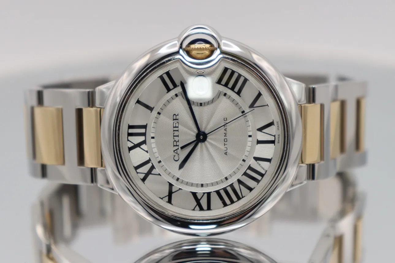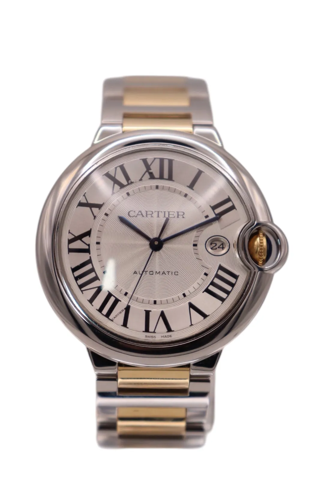 Cartier Ballon Bleu with stainless steel case and steel and 18ct gold bracelet. White dial with Roman numerals and sapphire crystal.