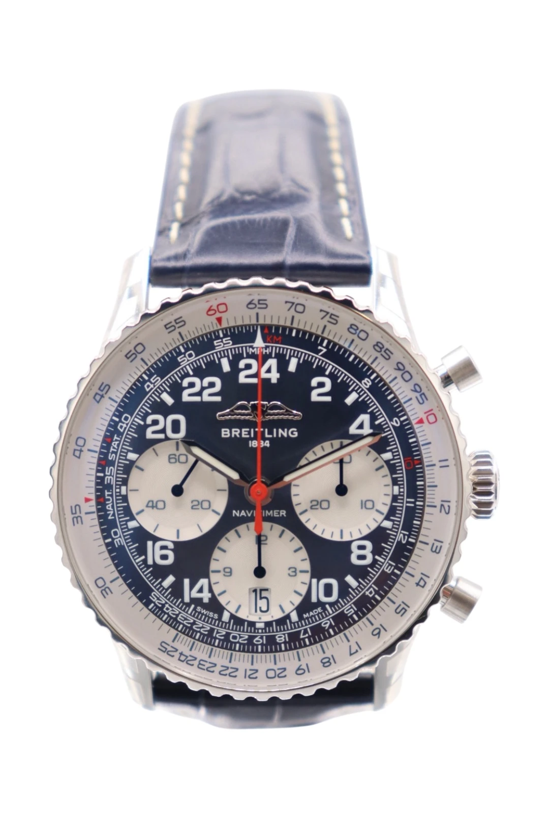 A rare collector’s piece crafted in platinum with timeless aviation heritage.The Breitling Navitimer B02 (ref. LB0240) is a remarkable expression of the brand’s iconic aviation-inspired chronograph, reimagined with modern refinement. Crafted in a 41mm platinum case, it offers a luxurious and enduring presence, paired with a black leather strap that enhances its classic look.Driven by the Breitling Manufacture Calibre B02, a hand-wound mechanical chronograph movement, this watch delivers outstanding accuracy and a true connection to traditional watchmaking craftsmanship. Its sapphire crystalensures durability, while the platinum bezel highlights its exclusivity.