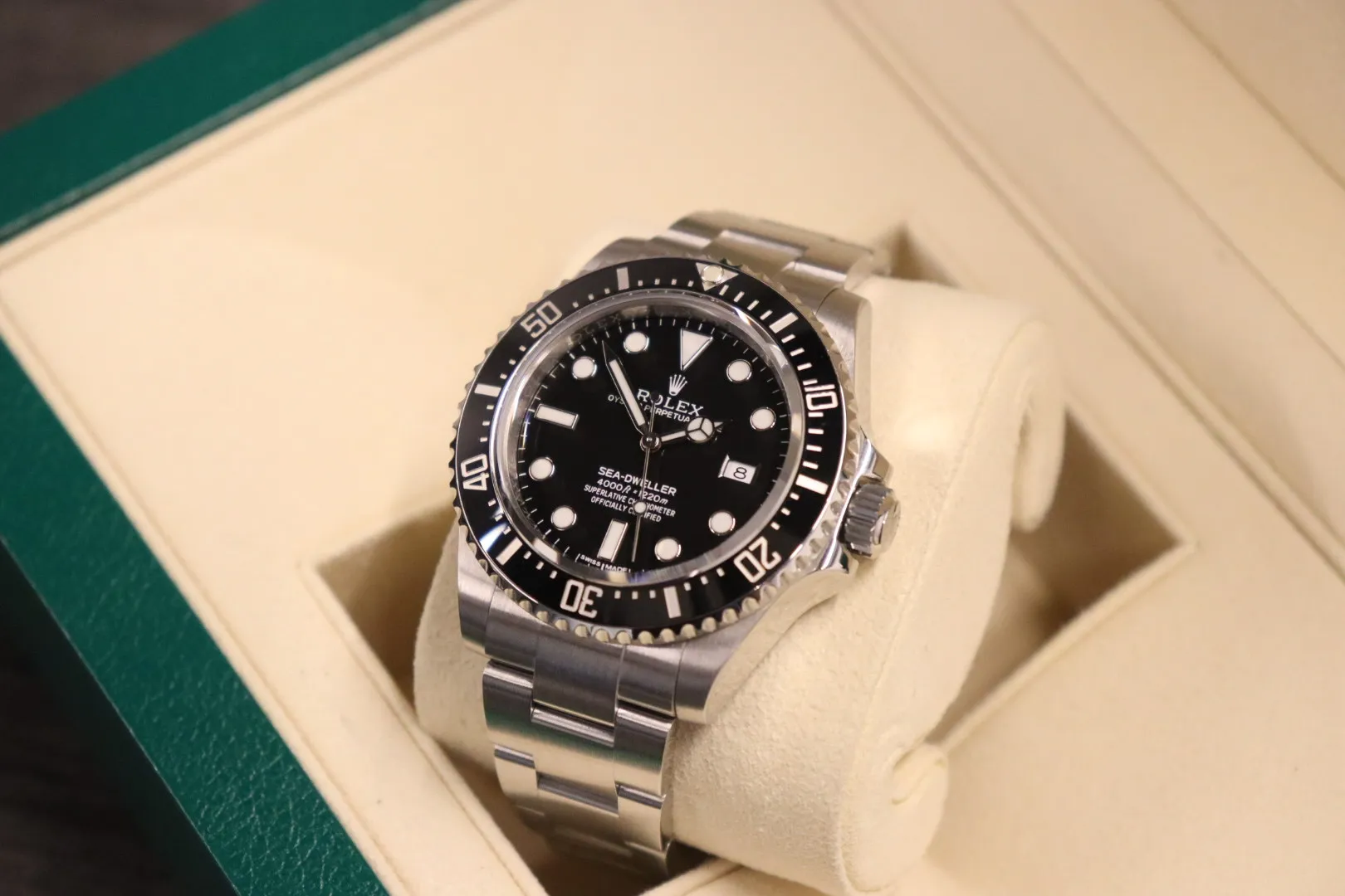 A true professional dive watch, the Rolex Sea-Dweller 4000 Ref. 116600 is one of the most robust and technically capable models in the Rolex lineup. Produced for a relatively short period, this reference has become increasingly sought-after for its clean proportions, absence of a Cyclops lens, and strong connection to Rolex’s deep-sea heritage.This 2015 example features a 40mm stainless steel Oyster case paired with the iconic Oyster bracelet, offering exceptional durability and wrist presence. The black dial is fitted with luminous hour markers and Mercedes hands, ensuring outstanding legibility in all conditions. The unidirectional black Cerachrom bezel is highly resistant to scratches and fading, while the domed sapphire crystal maintains clarity without the Cyclops magnifier—preserving the Sea-Dweller’s distinctive tool-watch aesthetic.Engineered for extreme environments, the Sea-Dweller 4000 is water-resistant to 1,220 metres (4,000 feet) and equipped with a helium escape valve, making it suitable for professional saturation diving. Powered by the Rolex Calibre 3135 automatic movement, it delivers proven reliability, precision, and a 48-hour power reserve.This example benefits from a Rolex service carried out in 2021, adding confidence and long-term reliability. Presented in good condition, the watch comes complete with its original box and papers, has been fully verified via Watch Register, and includes a 12-month warranty for complete peace of mind.