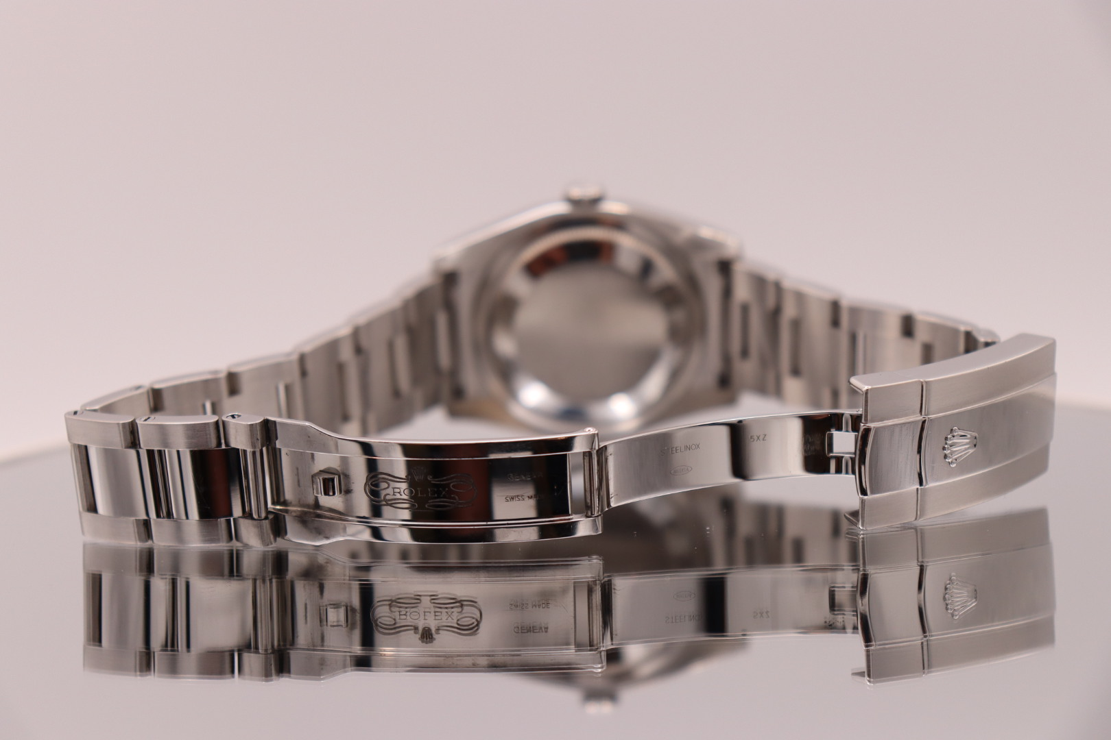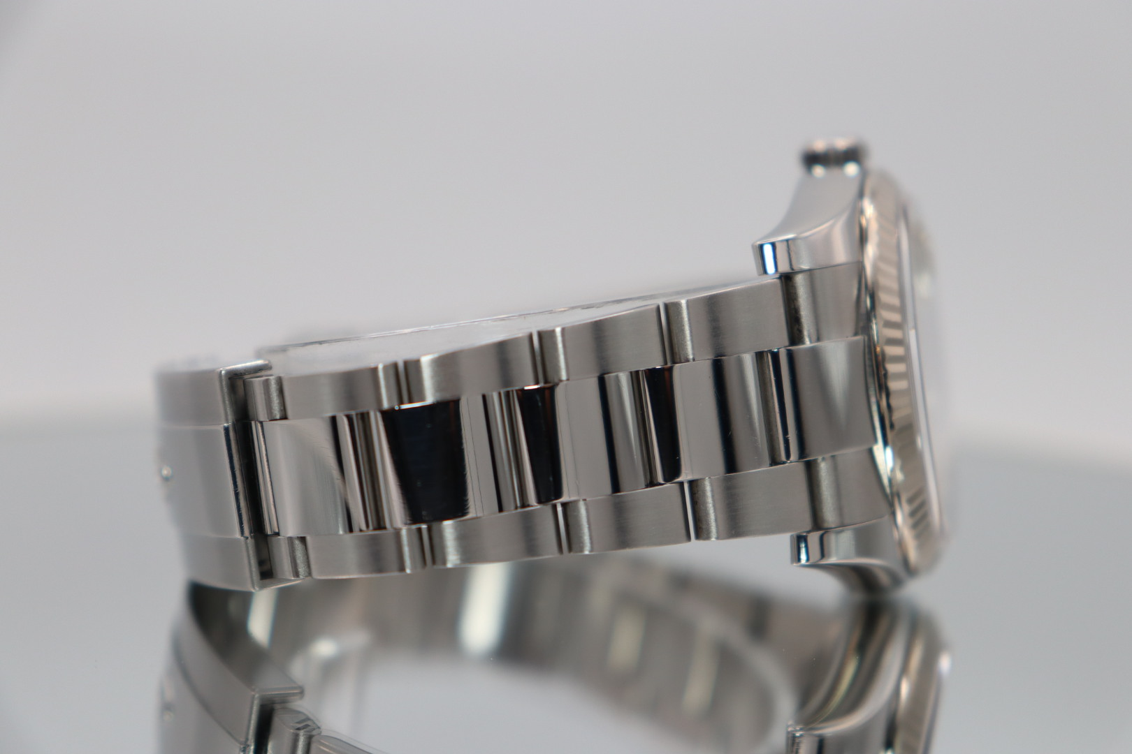 This 2018 example features a 36mm stainless steel Oyster case paired with an 18ct white gold fluted bezel, adding depth and signature Rolex character. The black dial is fitted with Roman numeral hour markers, offering a refined and sophisticated appearance with excellent legibility.