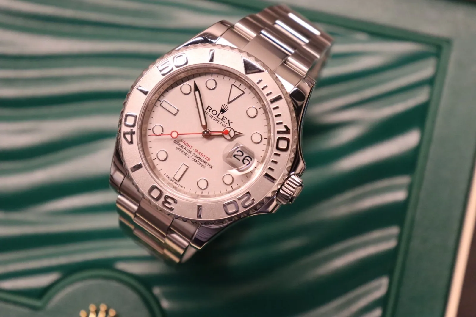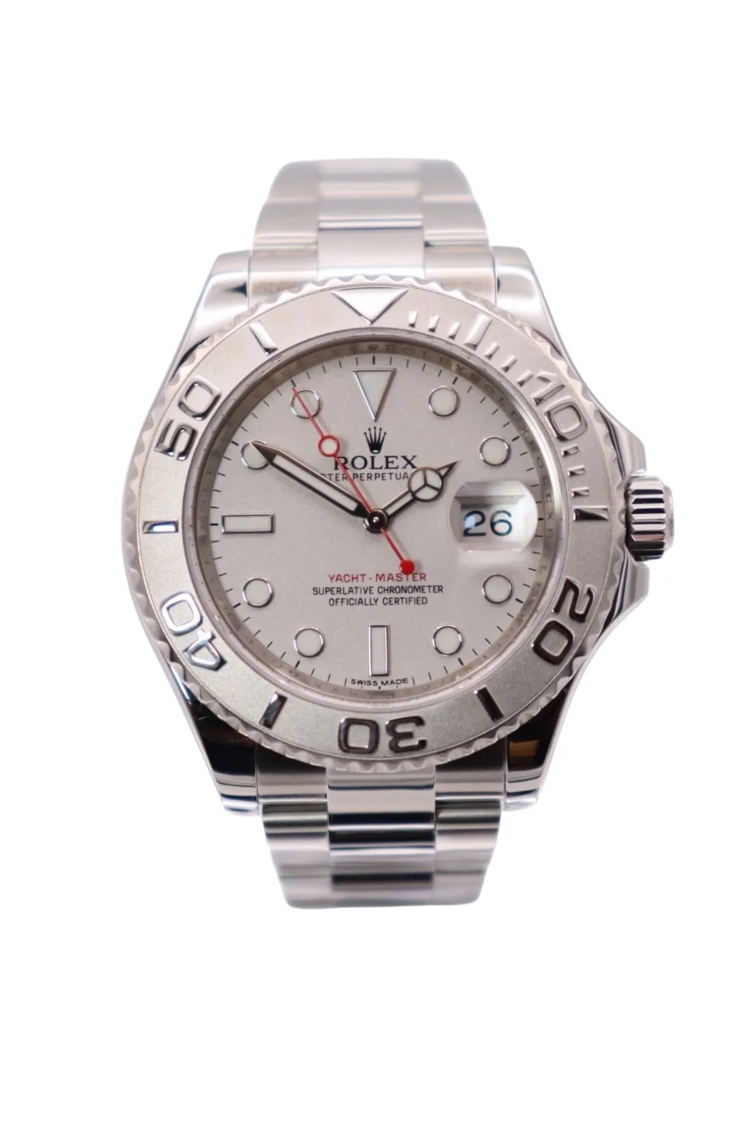Sporty yet refined, the Rolex Yacht-Master 40 reference 116622 perfectly balances luxury and performance. Crafted in Rolex’s signature Rolesium configuration—combining Oystersteel with a solid platinum bezel—this model offers a more elevated and understated take on the brand’s professional sports watch range.This circa 2014 example features a 40mm Oystersteel case paired with a bidirectional rotatable platinum bezel, distinguished by its raised polished numerals set against a sandblasted background. The sophisticated grey (rhodium) dial enhances the watch’s contemporary aesthetic, complemented by rounded luminous hour markers and Mercedes hands for excellent legibility in all conditions. A scratch-resistant sapphire crystal with Cyclops lens over the date adds both durability and everyday practicality. The Oyster bracelet ensures comfort, strength, and a seamless finish on the wrist.At its core is the Rolex Calibre 3135 automatic movement, a proven and highly respected workhorse known for its precision, robustness, and long-term reliability. As a Superlative Chronometer, it delivers exceptional accuracy, making it ideal for daily wear.Presented in good condition, this watch is supplied with its original box, has been fully verified via Watch Register, and includes a 12-month warranty for complete peace of mind.