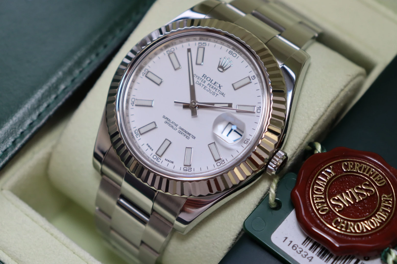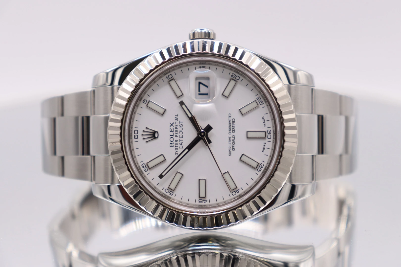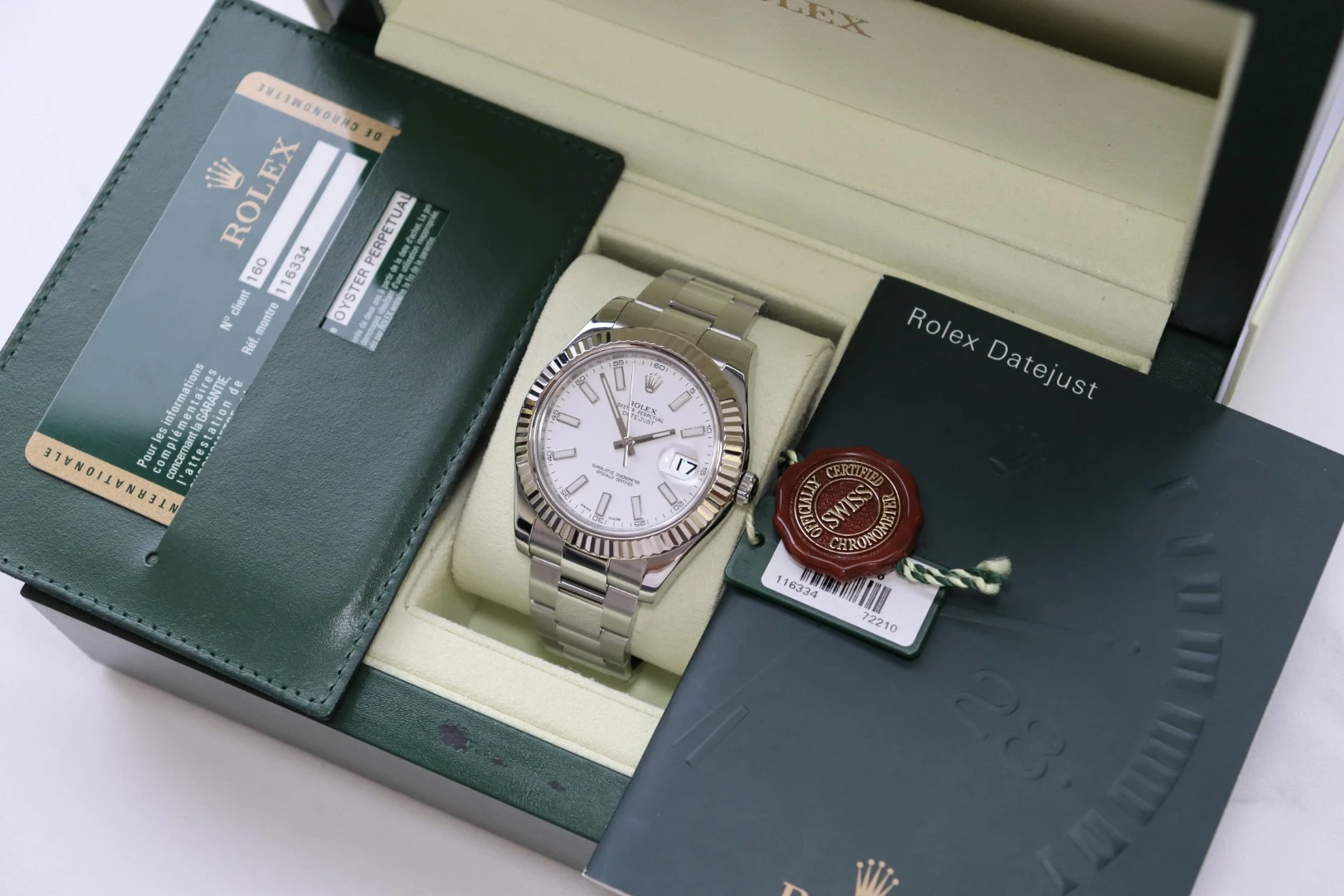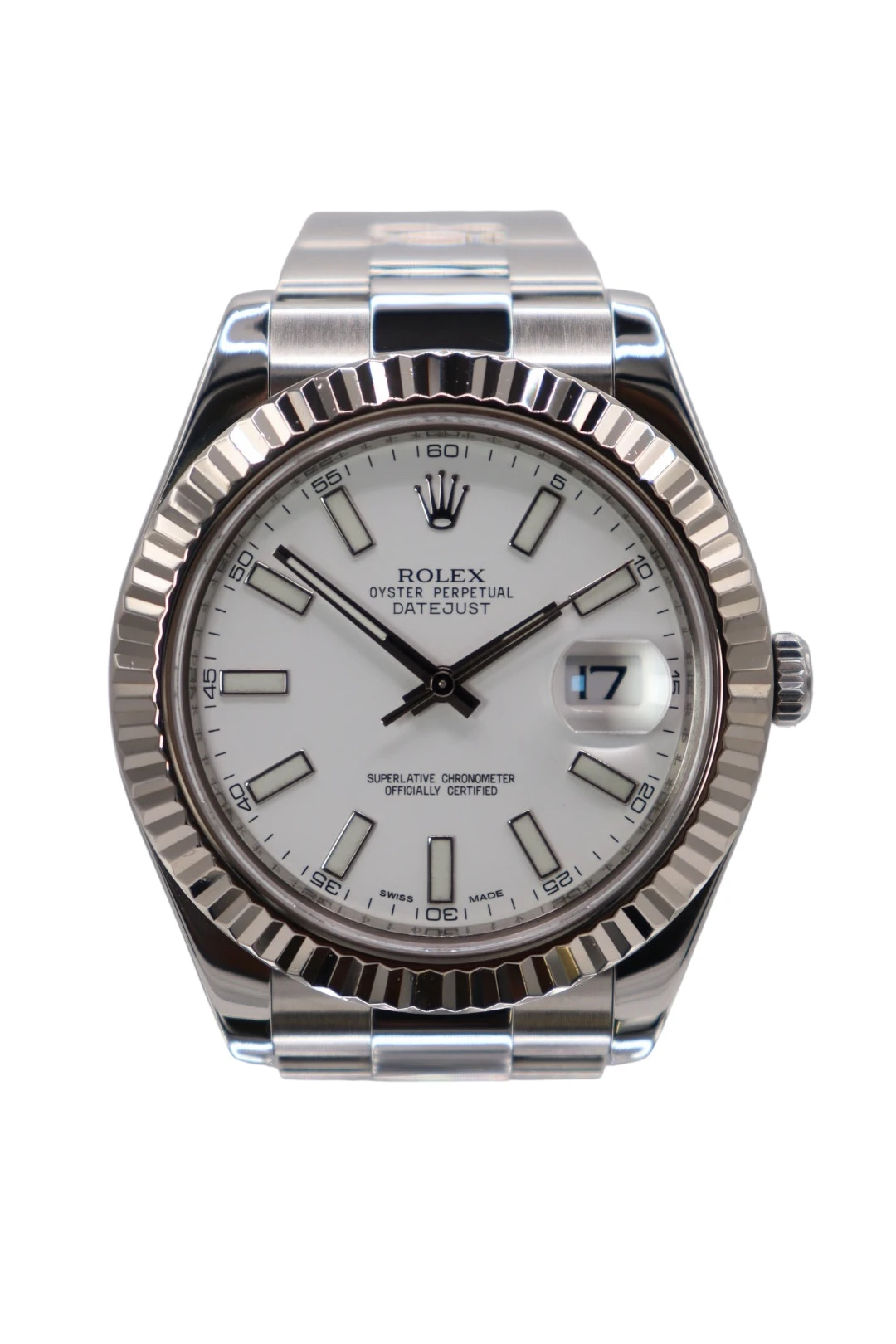 A bold take on a timeless classic, presented complete with box, papers, and accessories.The Rolex Datejust II (ref. 116334) combines the enduring elegance of the Datejust line with a more modern presence, featuring a 41mm stainless steel case that brings a contemporary edge to this iconic design. This 2009 example is refined yet versatile, with its crisp white dial and applied baton hour markers offering excellent legibility and understated sophistication.Framing the dial is a finely fluted 18K white gold bezel, a hallmark of Rolex craftsmanship that adds a subtle yet unmistakable luxury. Powered by an automatic movement, the Datejust II ensures precision and reliability, housed beneath a scratch-resistant sapphire crystal. The stainless steel Oyster bracelet completes the look, blending strength with elegance for everyday wear.Includes | Box, Papers & Accessories |
