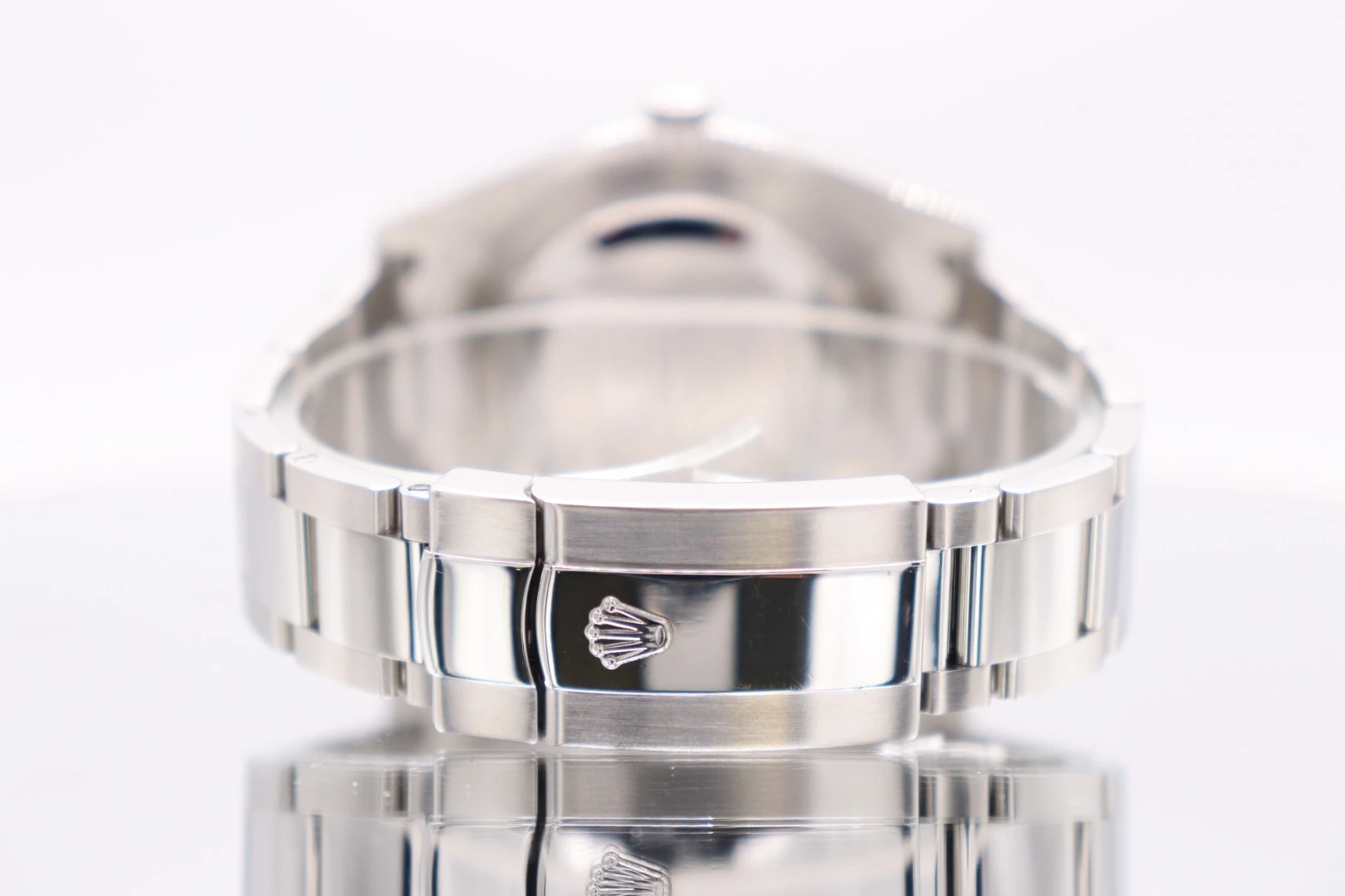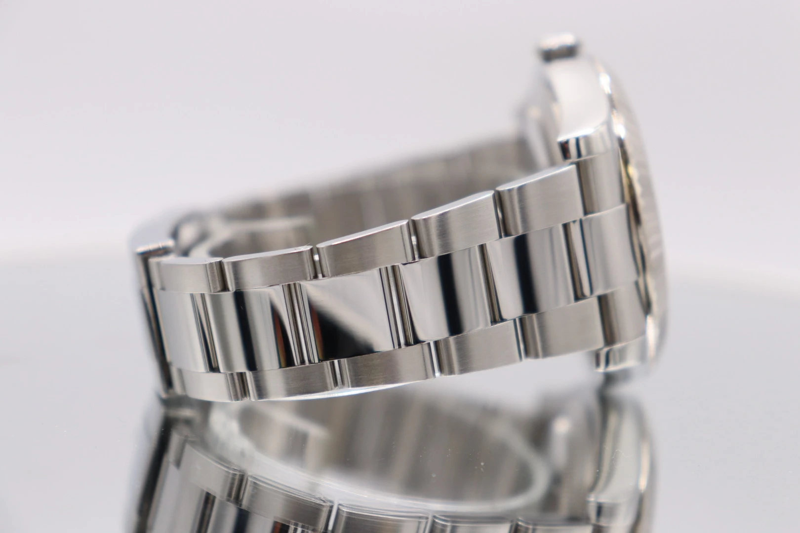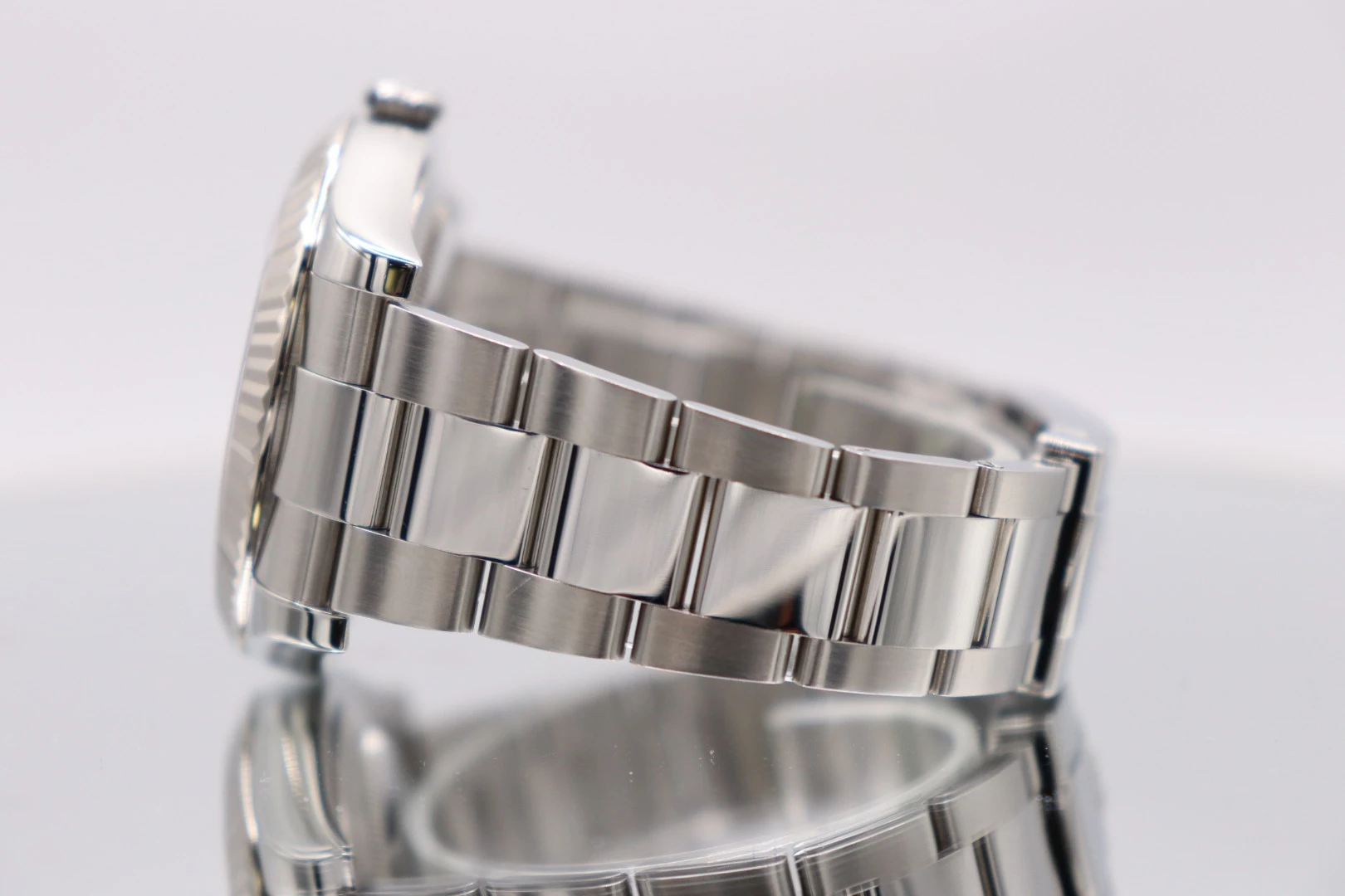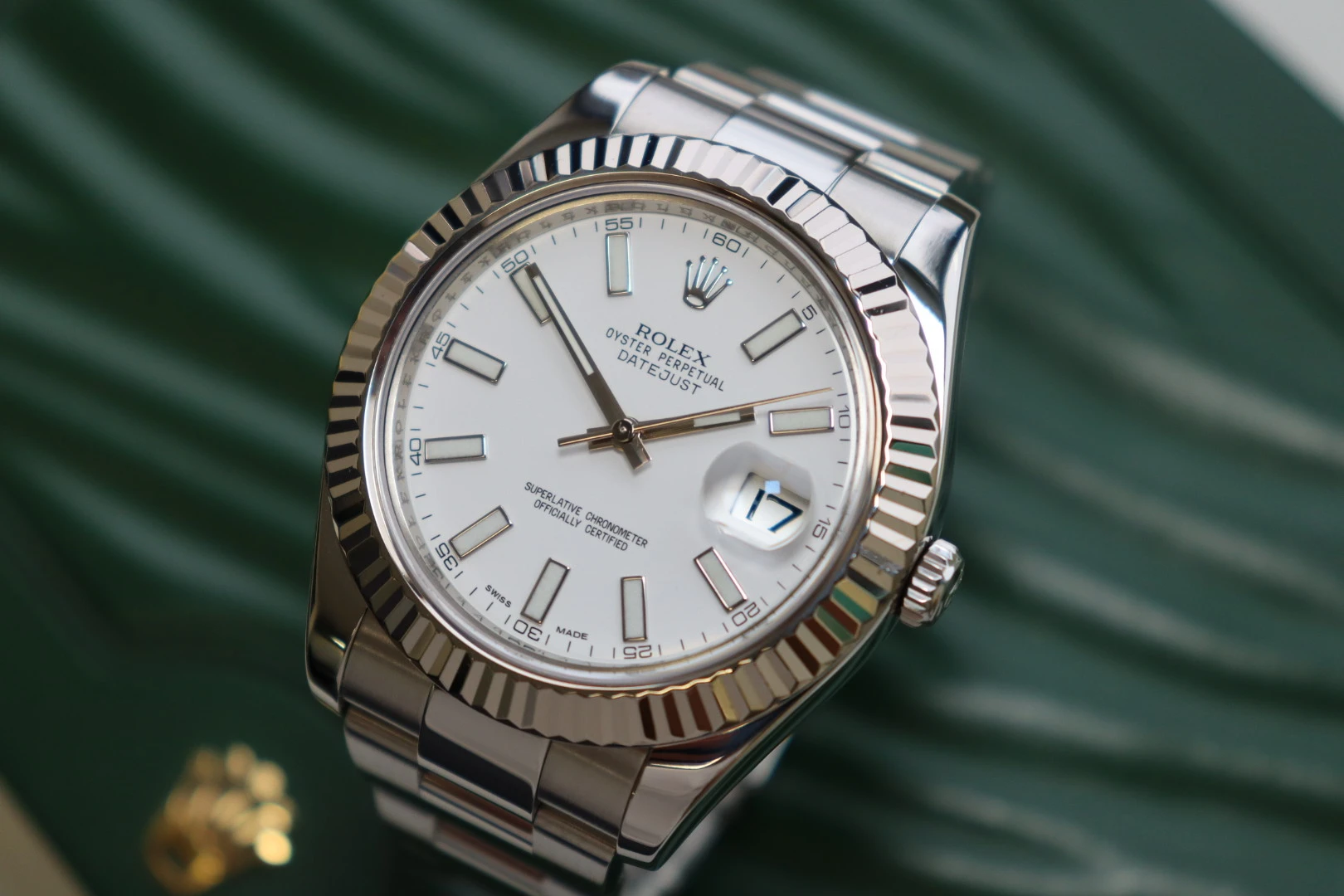 A bold take on a timeless classic, presented complete with box, papers, and accessories.The Rolex Datejust II (ref. 116334) combines the enduring elegance of the Datejust line with a more modern presence, featuring a 41mm stainless steel case that brings a contemporary edge to this iconic design. This 2009 example is refined yet versatile, with its crisp white dial and applied baton hour markers offering excellent legibility and understated sophistication.Framing the dial is a finely fluted 18K white gold bezel, a hallmark of Rolex craftsmanship that adds a subtle yet unmistakable luxury. Powered by an automatic movement, the Datejust II ensures precision and reliability, housed beneath a scratch-resistant sapphire crystal. The stainless steel Oyster bracelet completes the look, blending strength with elegance for everyday wear.Includes | Box, Papers & Accessories |