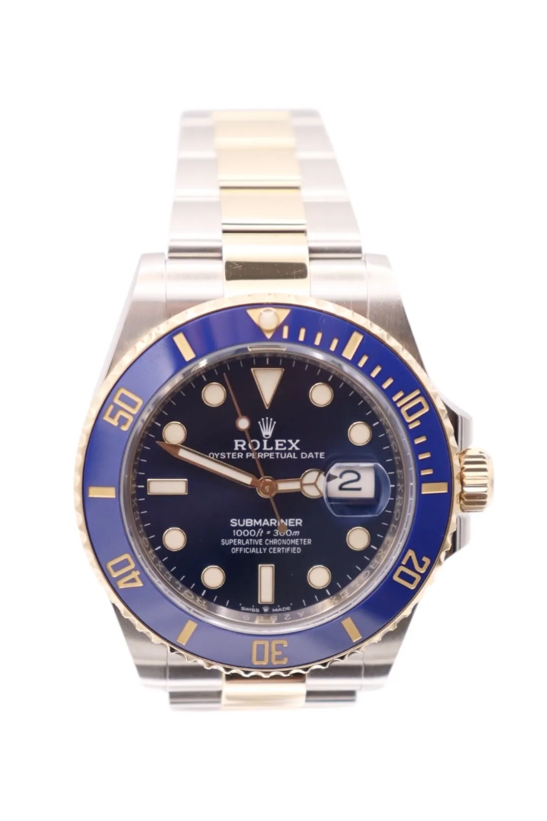 A striking fusion of professional dive watch capability and unmistakable Rolex luxury, the Submariner Date reference 126613LB stands as one of the most recognisable modern sports models in the collection. Combining robust Oystersteel with rich 18ct yellow gold, this two-tone configuration delivers both durability and bold wrist presence, further elevated by its iconic sunburst blue dial and matching ceramic bezel.This circa 2022 example features the updated 41mm Oyster case, offering refined proportions and improved ergonomics over previous generations. The unidirectional rotatable bezel is fitted with a blue Cerachrom insert, highly resistant to scratches and fading, with gold-filled numerals providing exceptional contrast. The vibrant blue dial is fitted with large Chromalight hour markers and Mercedes hands, ensuring outstanding legibility in all lighting conditions. A sapphire crystal with Cyclops lens enhances practicality while maintaining the Submariner’s signature aesthetic.At its core is the Rolex Calibre 3235 automatic movement, delivering exceptional precision, durability, and an impressive 70-hour power reserve. As a Superlative Chronometer, it is built to perform under all conditions, whether underwater or in everyday wear. The Oyster bracelet, combining stainless steel and 18ct yellow gold, is fitted with the Glidelock extension system for precise on-the-fly adjustment and maximum comfort.Presented in good condition, this watch is supplied with its original Rolex box, has been fully verified via Watch Register, and includes a 12-month warranty for complete peace of mind. Please note, original papers are not included.
