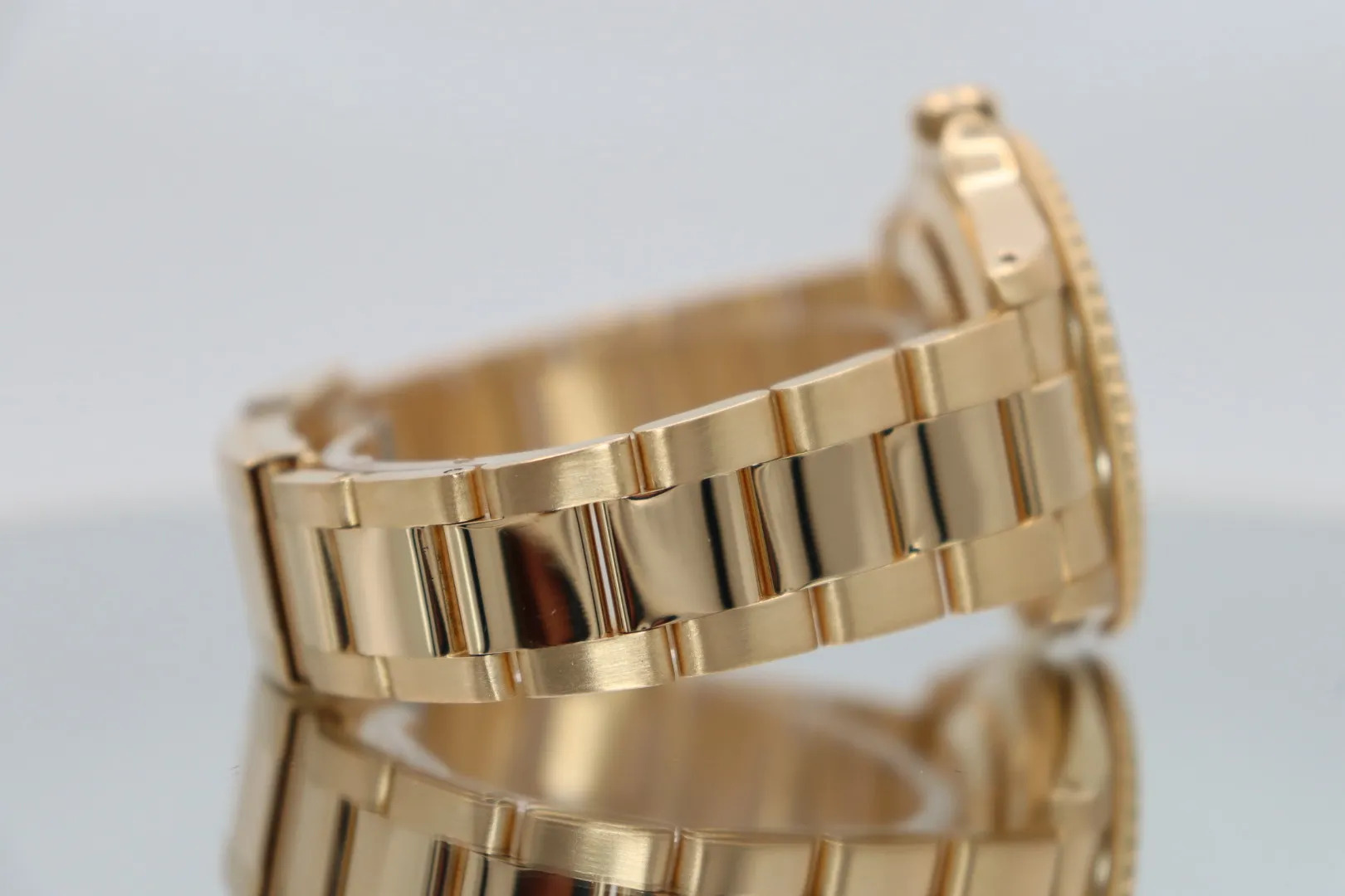 This 1990 example features a 40mm case crafted entirely from 18ct yellow gold, paired with a matching gold Oyster bracelet. The blue dial is complemented by a matching blue aluminium (pre-ceramic) bezel, creating the unmistakable and highly sought-after “Bluesy” aesthetic in full gold form.