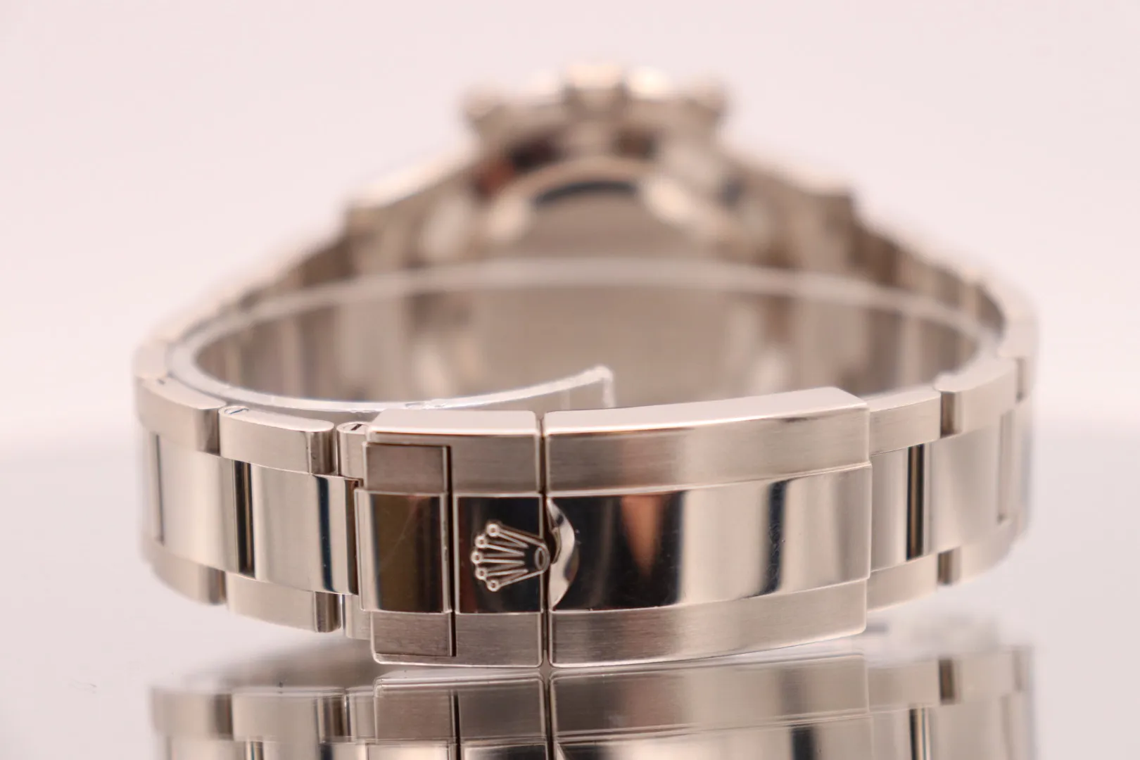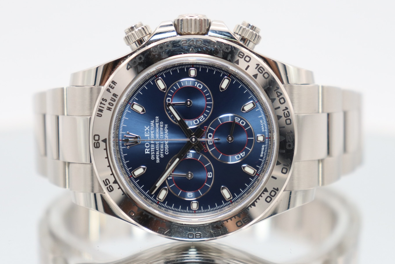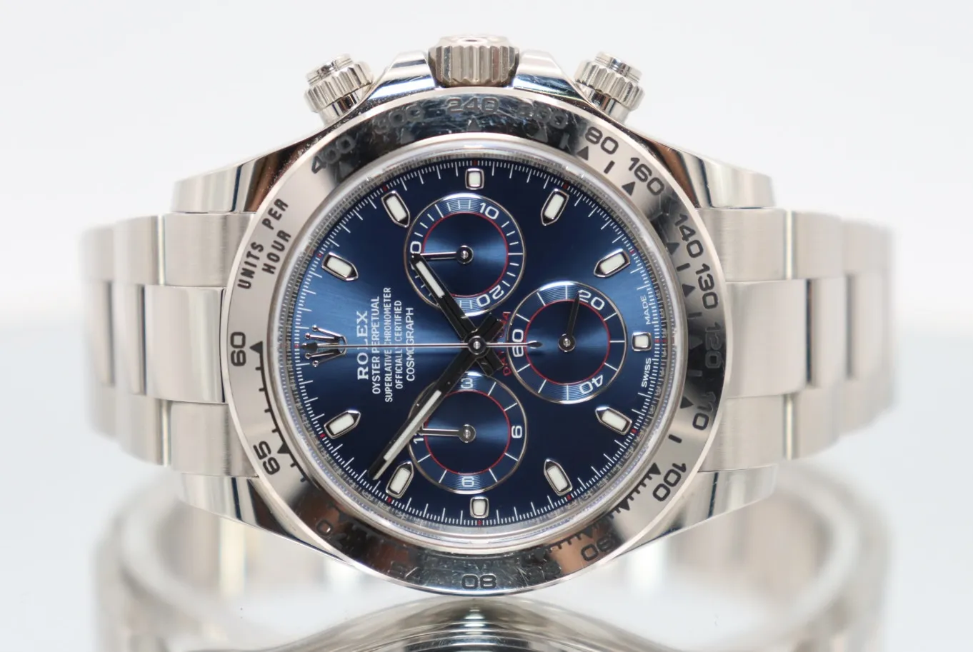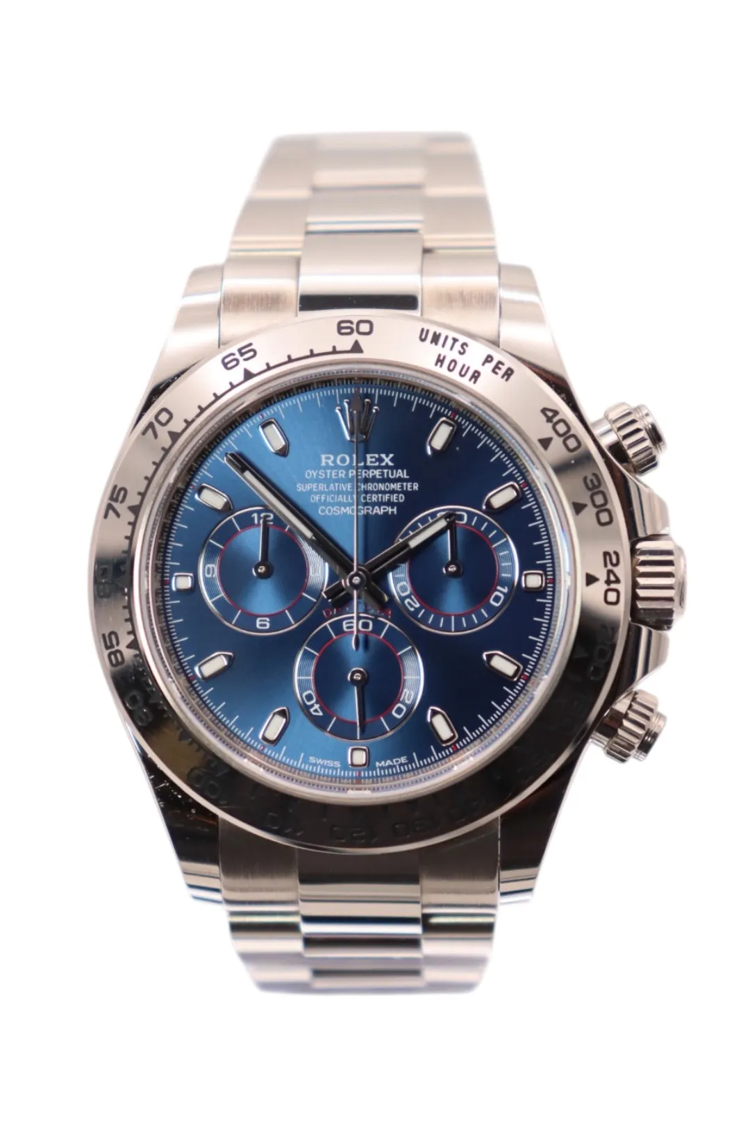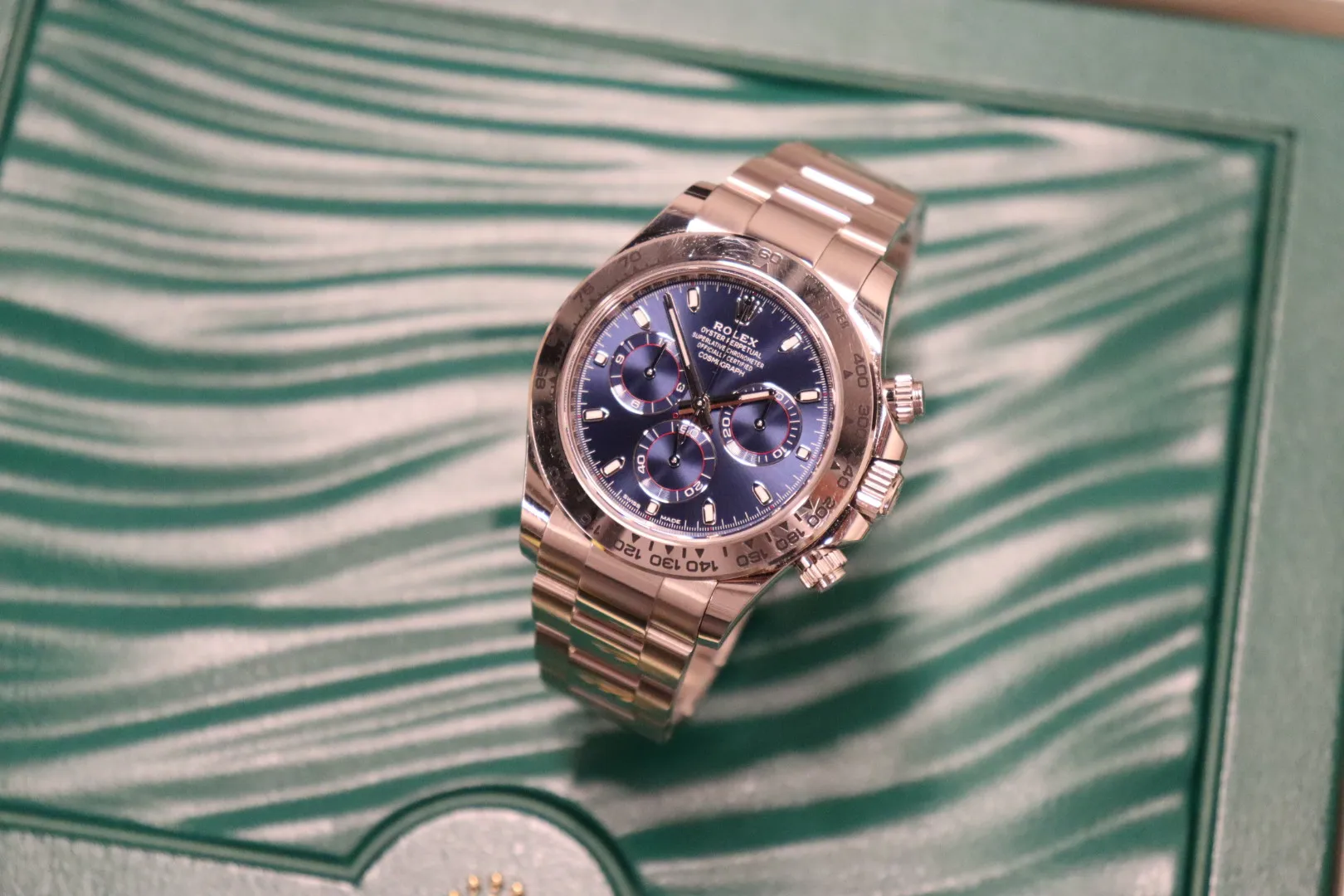 The fixed 18ct white gold bezel frames the dial, while a scratch-resistant sapphire crystal ensures durability and clarity. Equipped with chronograph functionality, the Daytona remains one of the most respected timing instruments in watchmaking.