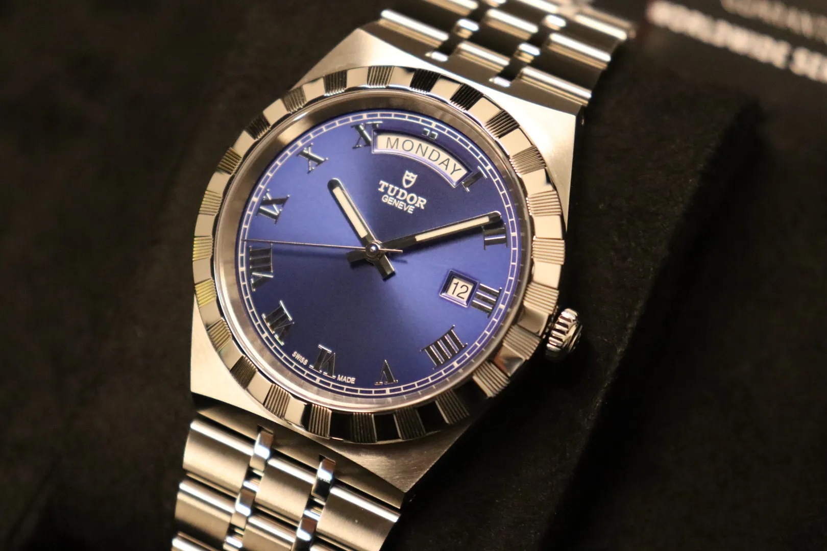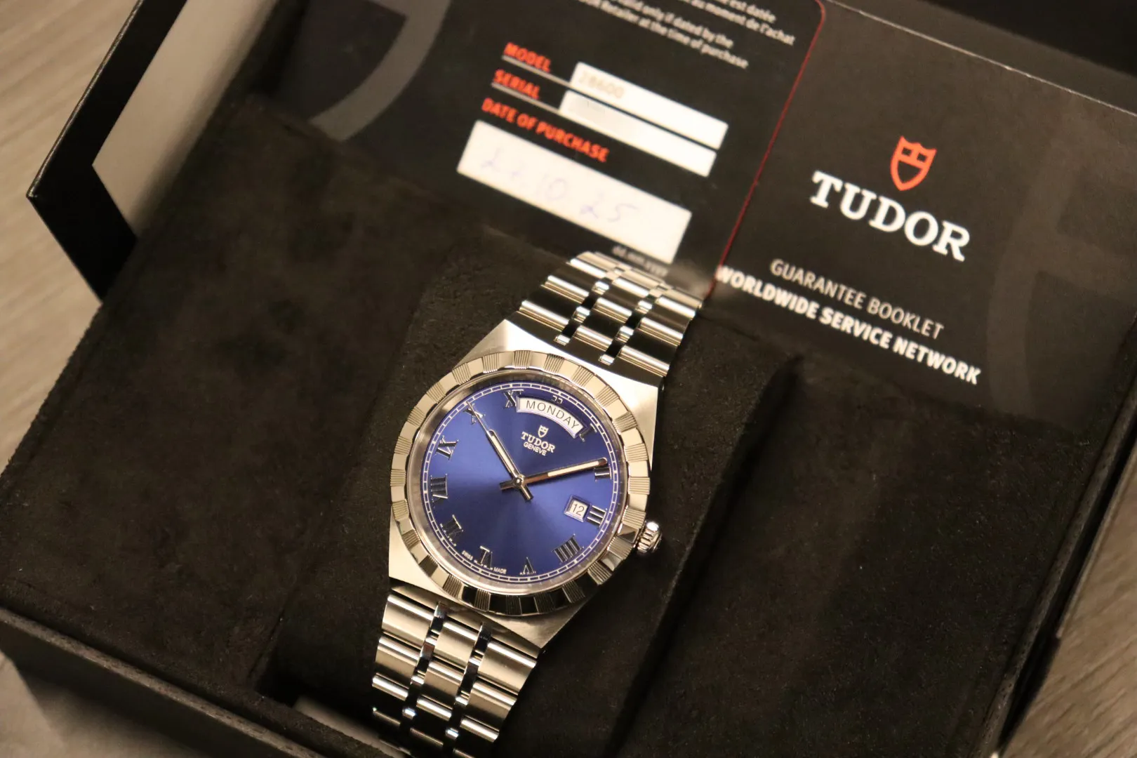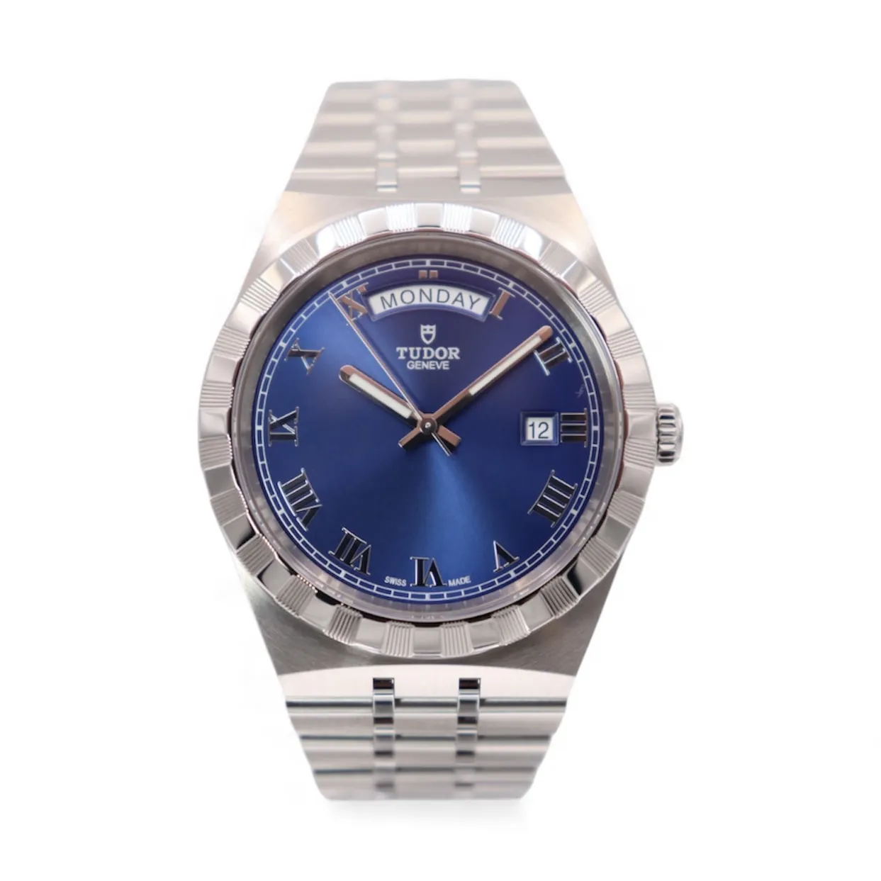 Ref. 28600 | 40mm | Stainless Steel Bracelet | Full Set | 12-Month TGL WarrantyThe Tudor Royal Day-Date 28600 exemplifies the perfect balance of elegance, functionality, and everyday wearability. Featuring a 40mm stainless steel case with Tudor’s signature notched bezel, this model reflects the brand’s distinctive design DNA, combining comfort, reliability, and refined style in a versatile package suitable for both casual and formal occasions.The blue sunburst dial is complemented by applied Roman numeral hour markers and features day and date apertures at 12 and 3 o’clock, providing both practicality and a refined aesthetic. Protected by a sapphire crystal, the dial remains crisp and clear, maintaining Tudor’s reputation for high-quality finishes.Powered by a robust automatic movement (Calibre MT5652), this watch delivers reliable performance and long-term durability. The integrated stainless steel bracelet adds seamless elegance while ensuring all-day comfort.Presented in good condition, this Tudor Royal Day-Date comes as a full set with original box and papers, has been fully verified via Watch Register, and is backed by a 12-month Time Group London warranty, giving complete peace of mind.